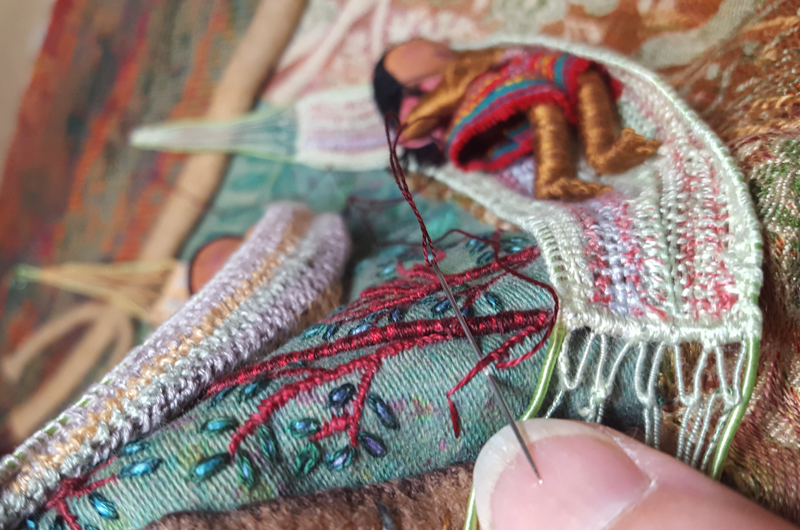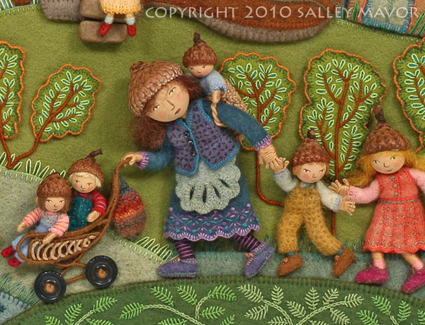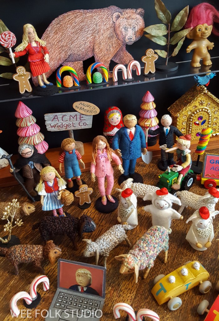 Even though conventional needlework businesses don’t completely mesh with what I do, I am a part of it because I’ve authored a how-to book which is marketed within this world. But other than that, I operate independently, outside of the mainstream. That is not surprising, since my work is generally an anomaly in any group I’m lumped into; embroidery, stumpwork, dolls, art quilts, miniatures, fiber art, children books, etc. The narrative and storytelling aspect of my fabric relief pieces doesn’t really fit into the abstract, conceptual contemporary fiber art scene. I suppose that writing Felt Wee Folk opened me up to being categorized as a teacher of doll making techniques. And since delving into political satire with the Wee Folk Players, my work is proving to be even harder to classify!