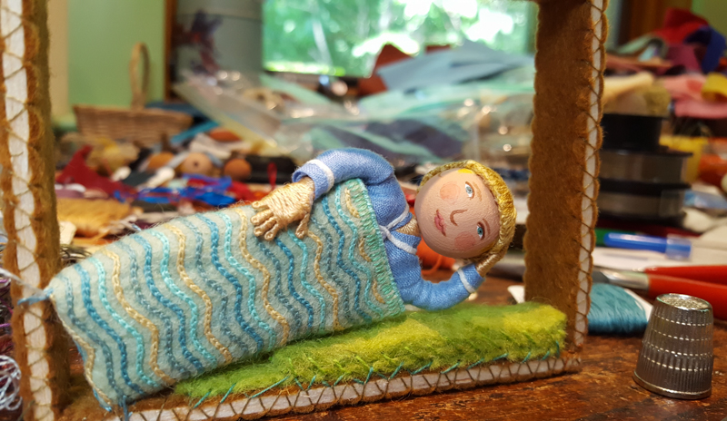 My children’s book illustrations and stand-alone pieces are much more involved and complicated than what I teach in Felt Wee Folk. Through 40 years of experimentation, I have devised methods of working that I consider proprietary knowledge. For instance, the way I make hands with little fingers is too linked to my personal artistic expression to show how in detail. I don’t want to upset the creative process by constantly organizing the steps in my mind and thinking in terms of explaining it to another. That would hold me back and limit the possibilities. I think the act of creating shouldn’t be overly dissected, else it loses its magic.
