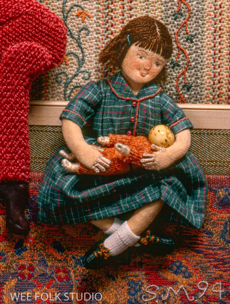 The chair was modeled after one in our living room that came from my (wool petticoat) grandmother. I changed the straight angular back into a rounded curve, which seemed to better reflect the subject matter. I sculpted the chair feet with Fimo dough. I used upholstery fabric for the chair, wallpaper (embellishment added), floor and carpet.