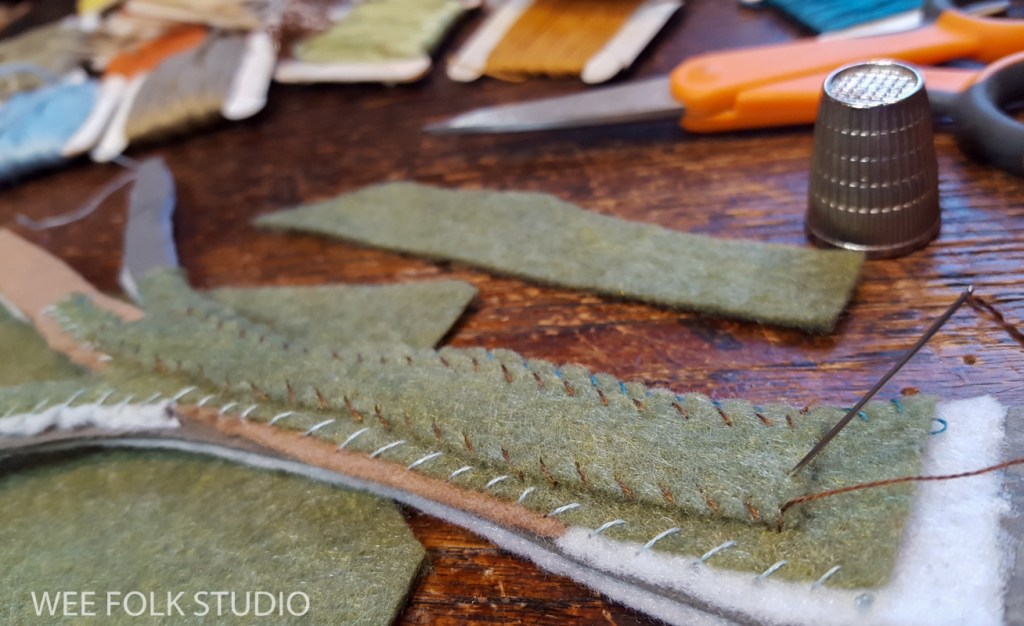 To give the mat board a stitch-friendly surface, I glued layers of thin quilt batting to the front and back of the mat board. That way, there was something to catch the needle onto. I built up the thickness of the trunk by sewing tapered layers of felt to the top.