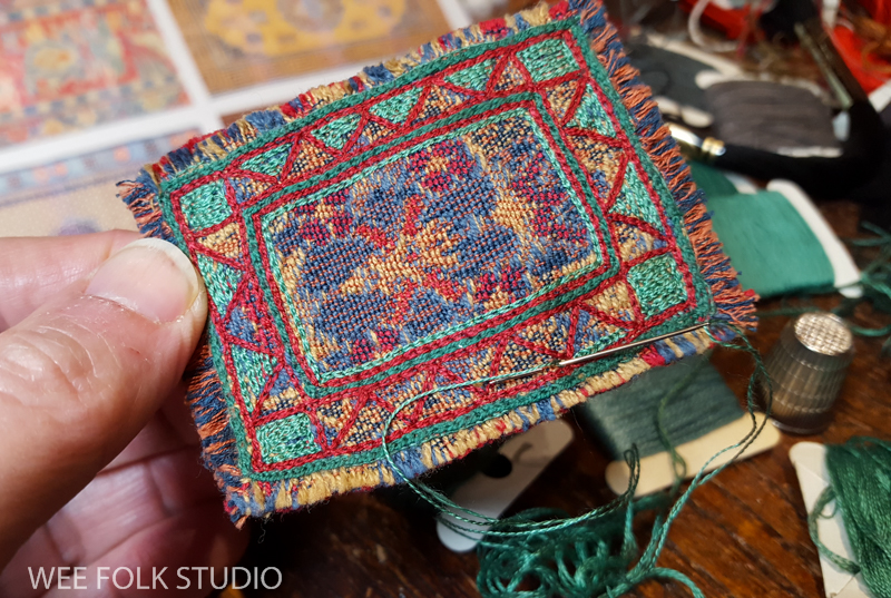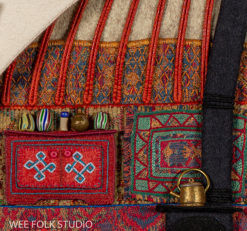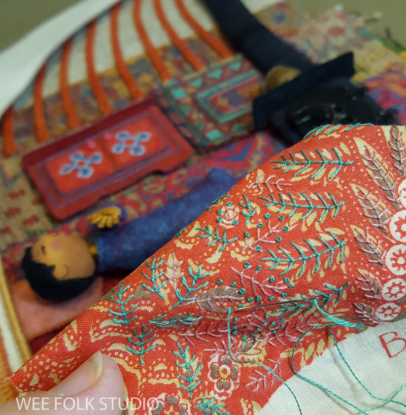 And lastly, I sewed glass and metal beads on top of the chest, just to make it look homey. I hope you enjoyed this behind the scenes peek at making the Mongolian scene. For a full list of posts about My Bed, please refer to this page.