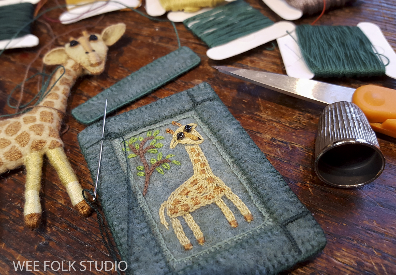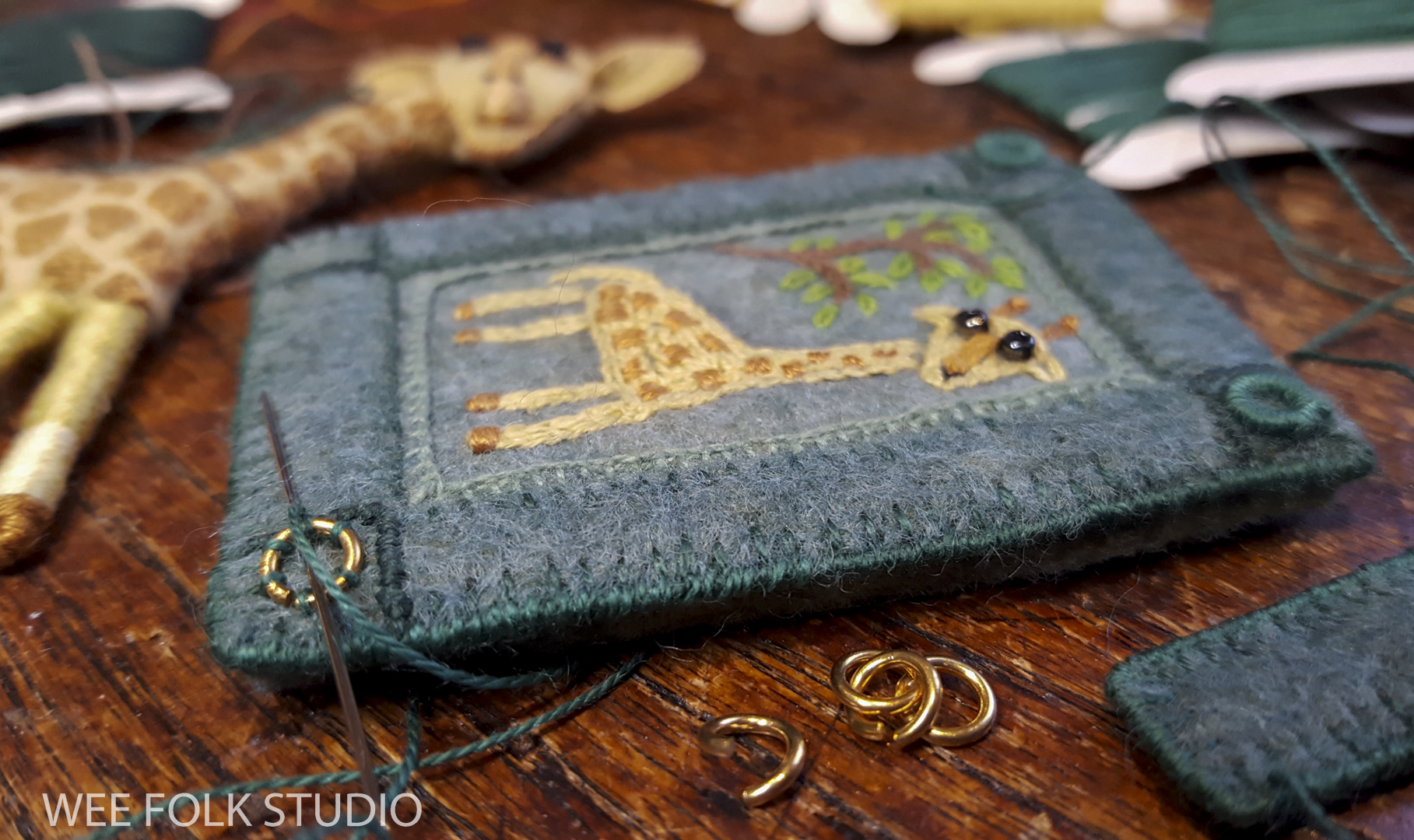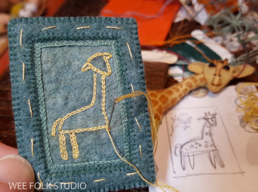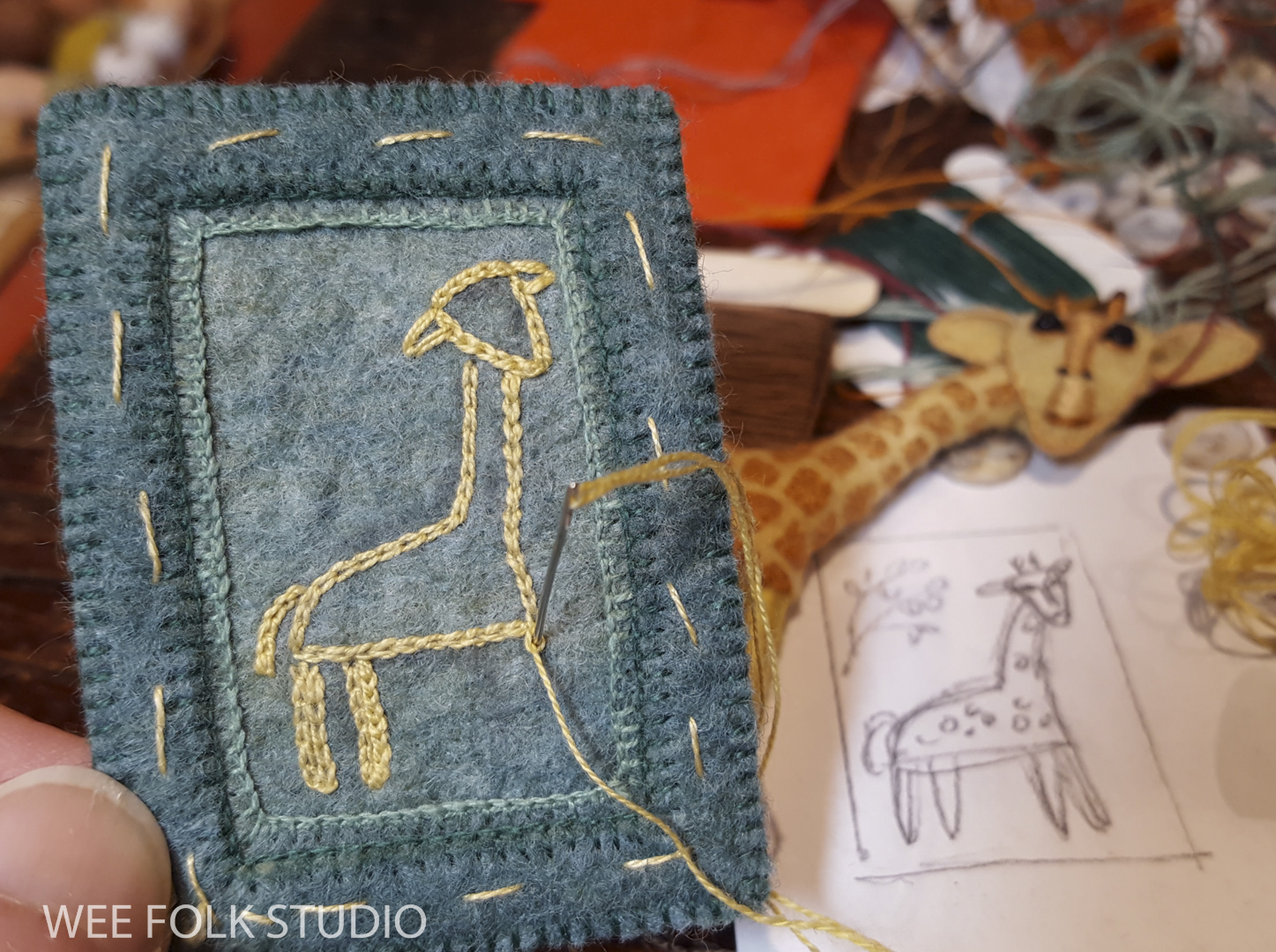 I chain stitched a simple outline of a giraffe and filled it in with more chain stitches and satin stitched spots. For eyes, I combed through my glass bead supply until I found 2 of the tiniest black ones