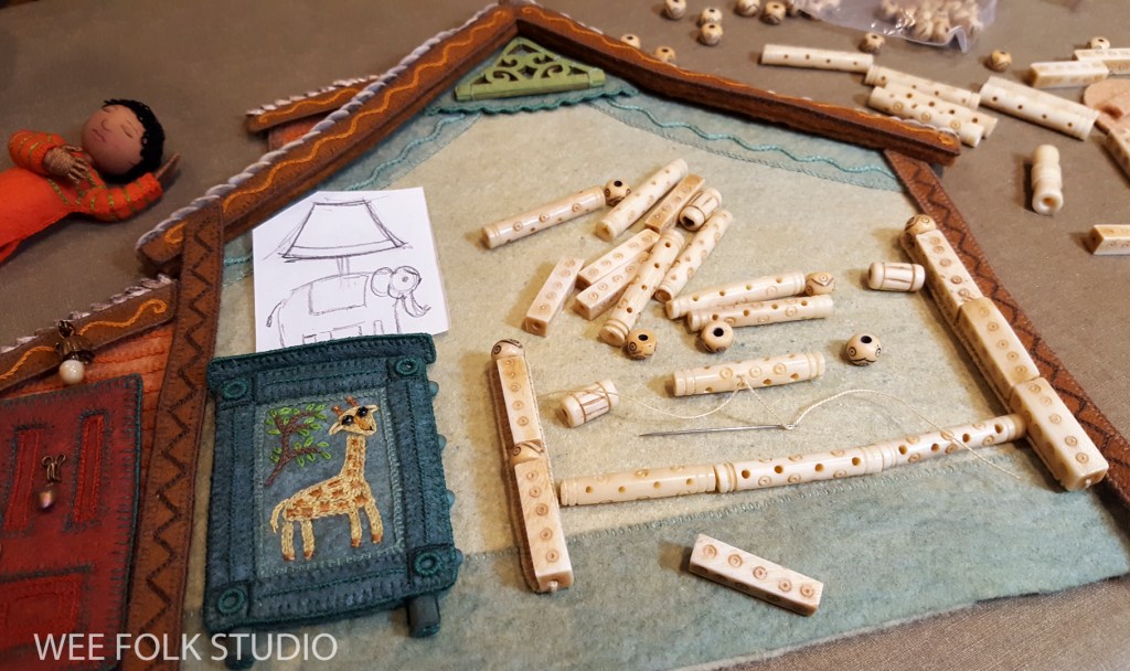 Creating a side view of the bed frame came next. It’s made with carved bone beads from Africa that I found at a bead show years ago.