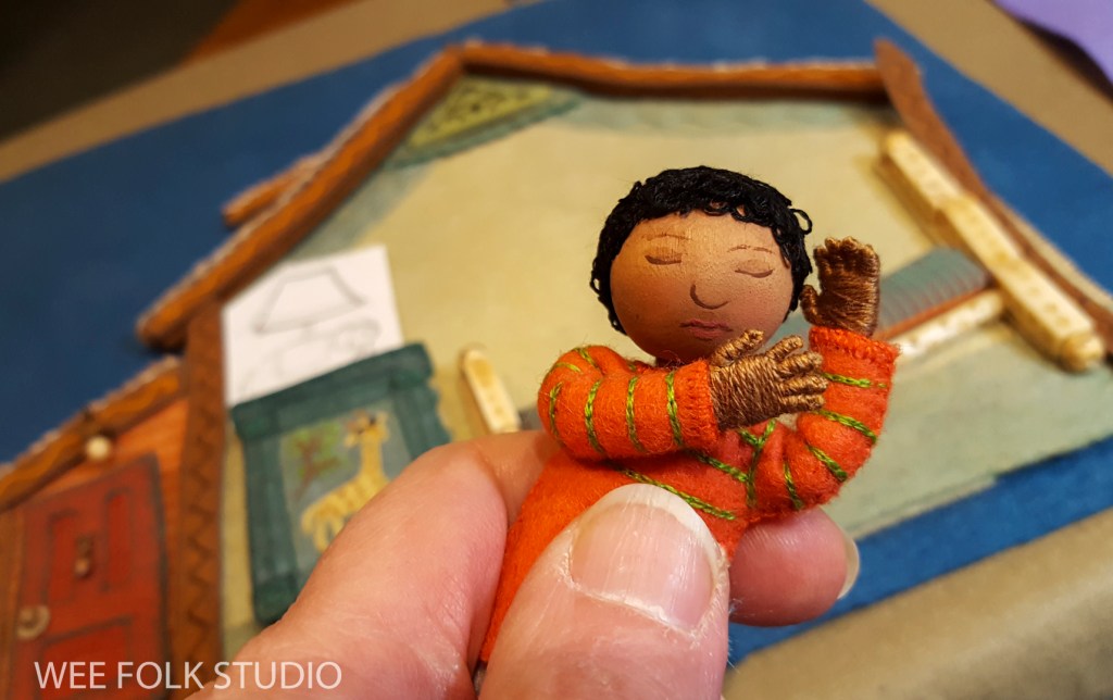 Since the child was going to be tucked under the covers, I only had to make the top half of their body. The figure is based on the dolls in my in my how-to book, Felt Wee Folk.