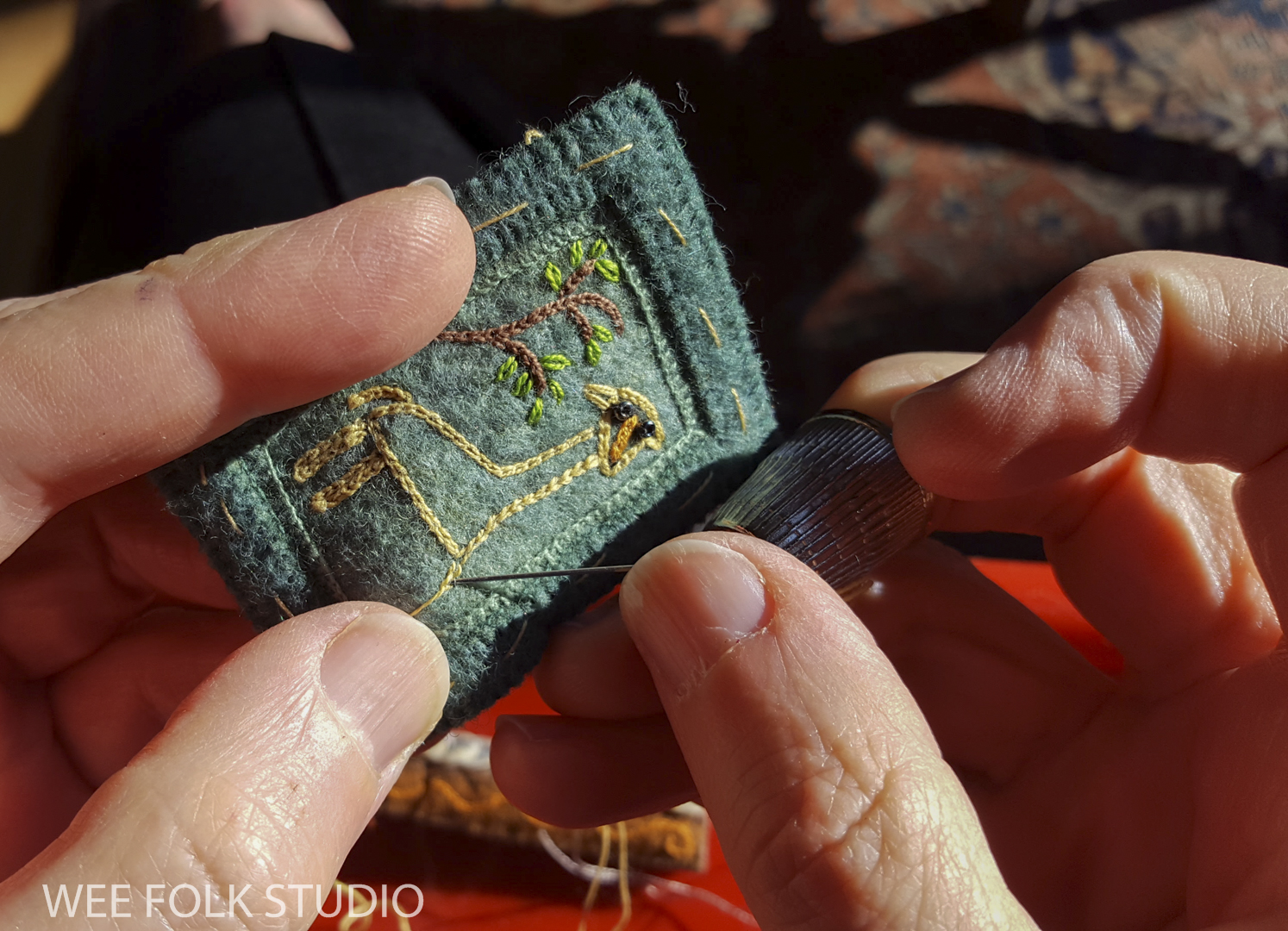 After adding a branch and leaves, I sewed wire around the outside edge to give the panel more structure. And for extra emphasis, I went over every edge and corner with a darker shade of green embroidery floss.