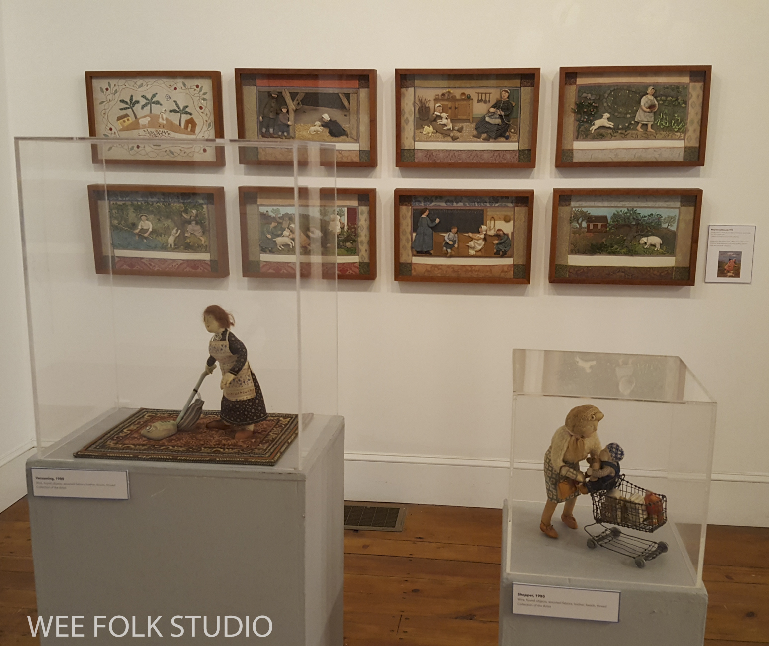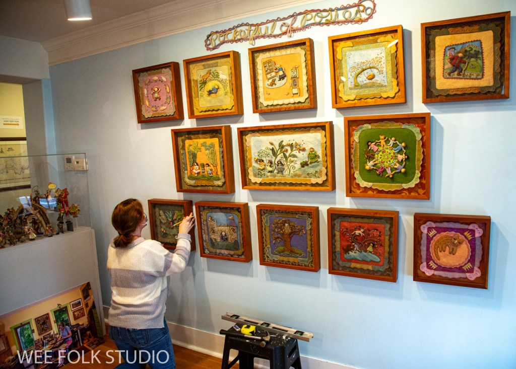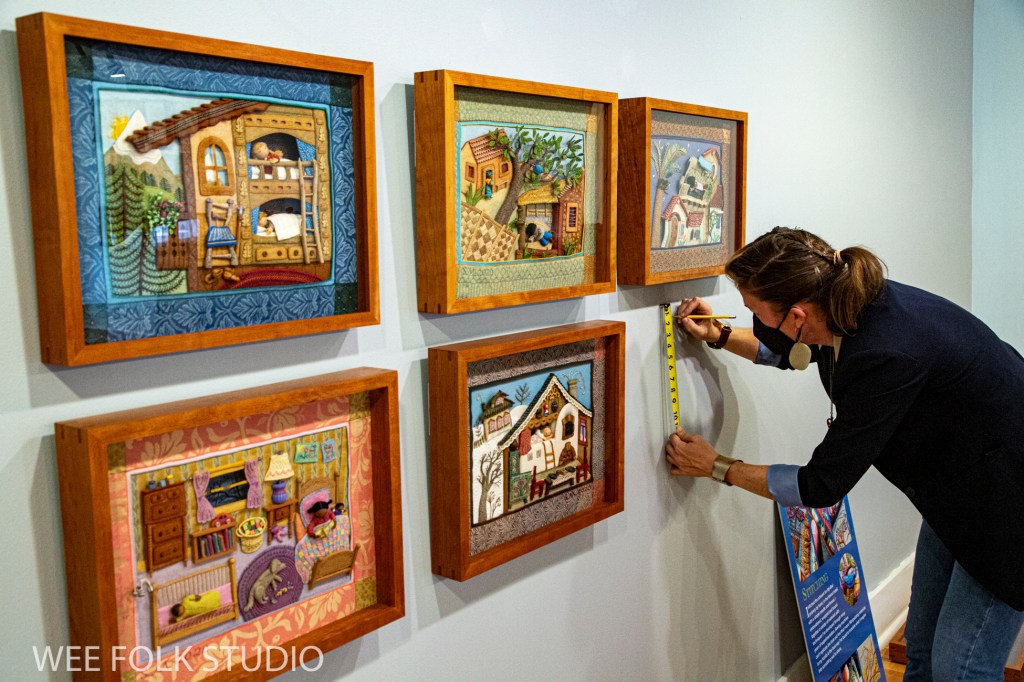 Once the artwork was unpacked, the museum staff got to work installing the show. Here’s Leanne Hayden, the collections and exhibition manager hanging Noah’s Ark and a group of ornaments over the mantelpiece in the first gallery. I made the ornaments about 10 years ago for the Family Trees event at the Concord Museum.