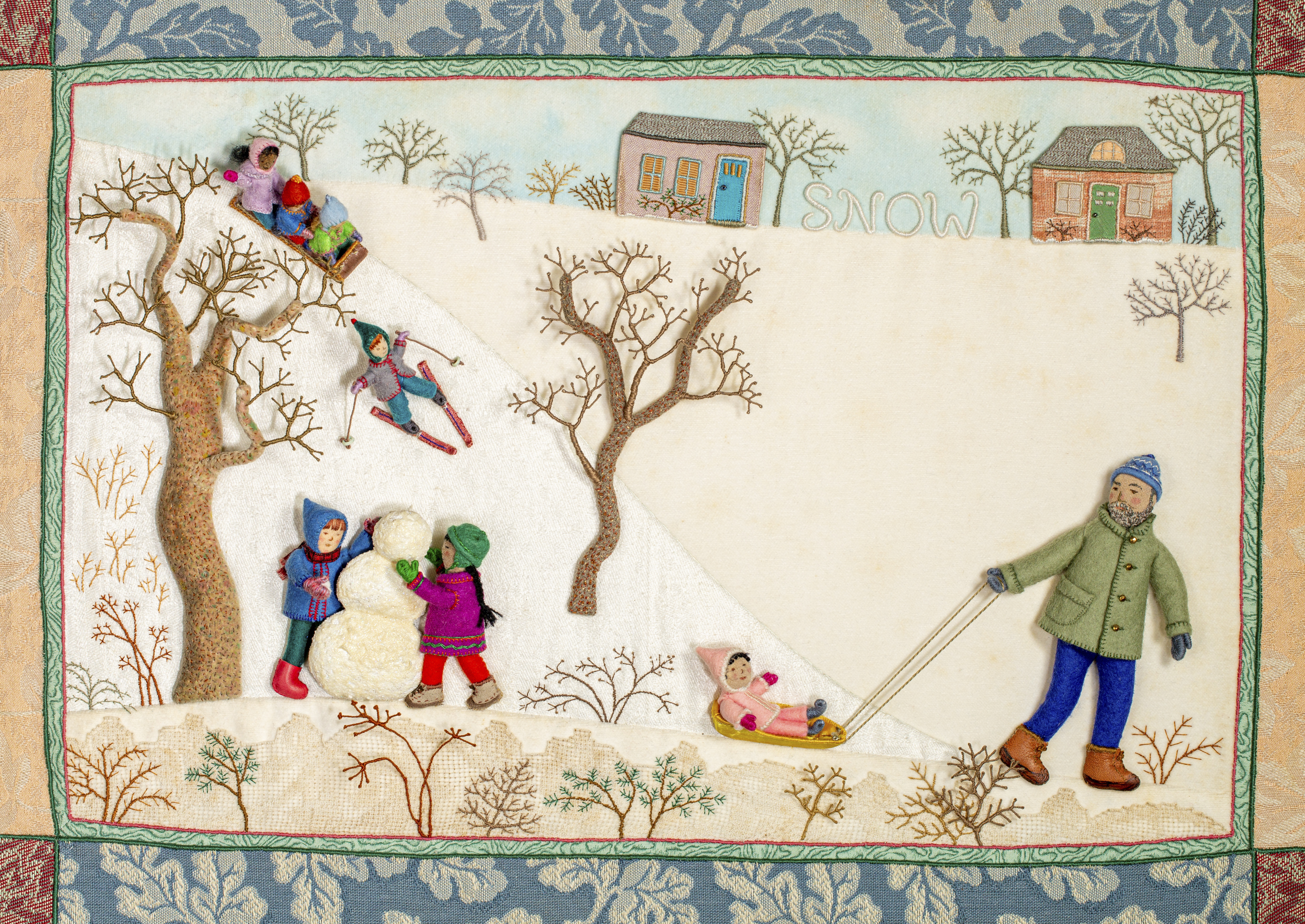 Are you looking for a cheerful, wintry Holiday card to send to family and friends this year? I just added this snow scene to the line of note cards in my Etsy Shop. Snow was an illustration in my 1997 picture book, You and Me: Poems of Friendship. We recently rephotographed the original fabric relief piece after borrowing it from the person who bought it years ago. The image just called out to be made into a card! It and other cards in my shop are sold in packs of 4 and 8. Snow is also part of the Winter Sampler, which includes 4 different winter scenes populated with warmly dressed wee folk characters happily playing in the snow and fairies riding reindeer.
