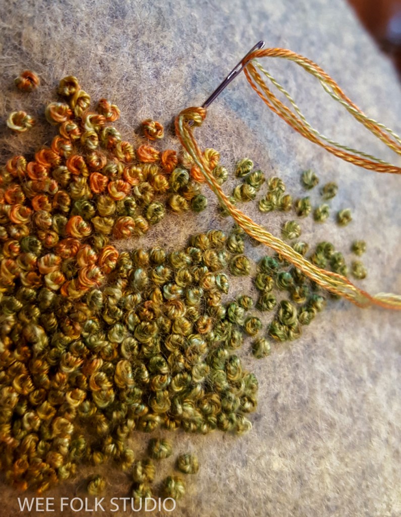 To stabilize the floppy pieces of felt, I stitched and wrapped wire along the outside edges and then embroidered blades of grass.