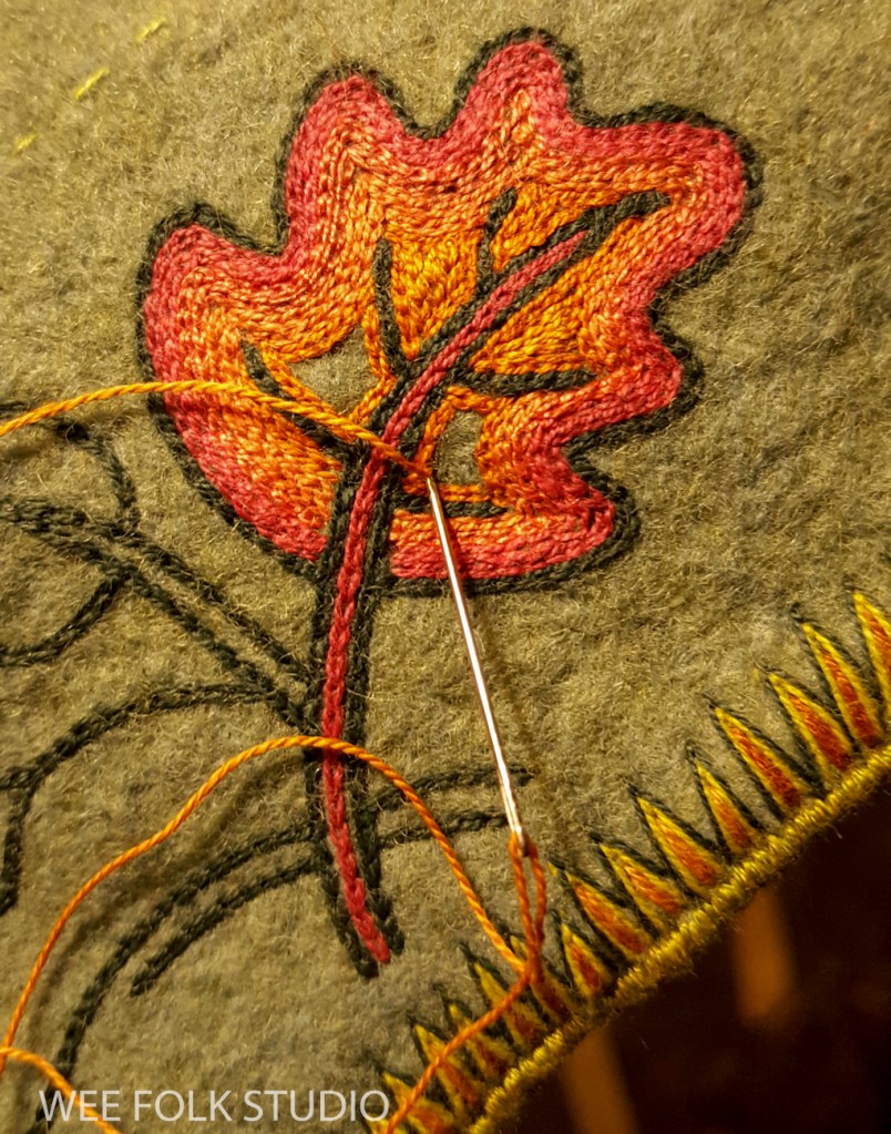 The orange and red leaves are chain stitched with DMC flower thread, which unfortunately has been discontinued. It’s thicker and not as shiny as regular embroidery floss and has a sturdy feel that I find satisfying. I treasure my supply of flower thread and have enough to last my lifetime.