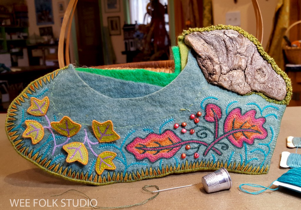 In future posts, I will focus on different aspects of making Harvest Time, including the toad stool mushroom, wee folk figures, storage containers, needle felted tunnels and cold cellars, roots, and stones.