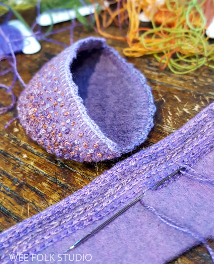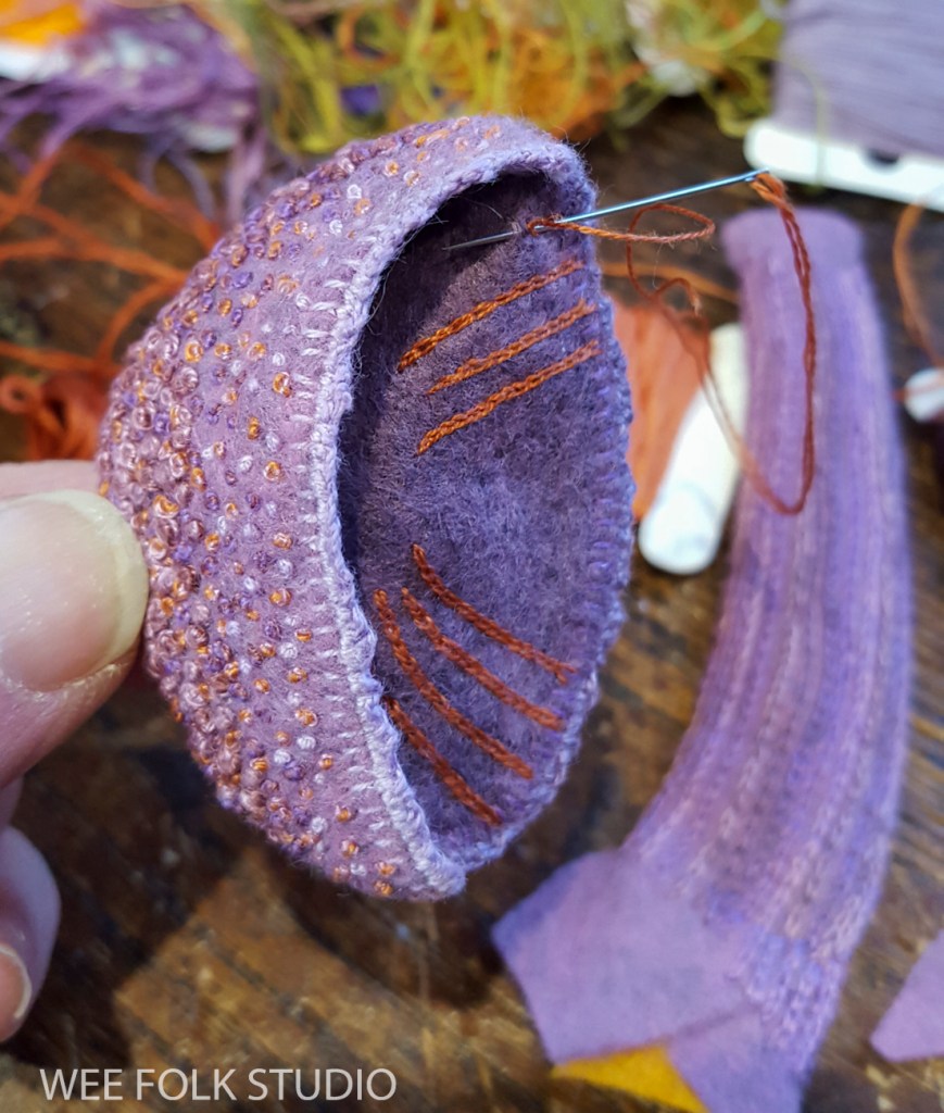 I sewed wire along the rim of the cap to help hold its curve. After covering the wire with stitches, I created an uneven edge with messy loops, so it would look more realistic. To make the bumpy texture on top, I stitched French knots with different shades of purple and orange embroidery floss.