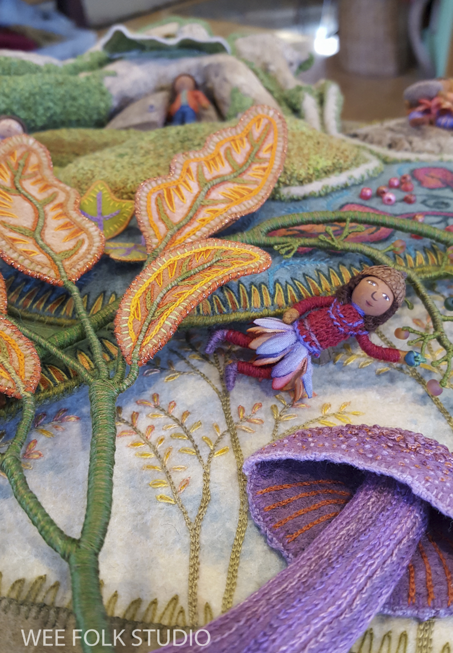 In Part 5 in the continuing series about making Harvest Time, I share photos and commentary about making the purple toadstool mushroom and the wee folk forager sitting under it. In the coming weeks, I will continue to post stories that focus on different aspects of making the fall scene, including the other wee folk figures, storage containers, tunnels, roots, and stones. So far, I’ve written the following posts: