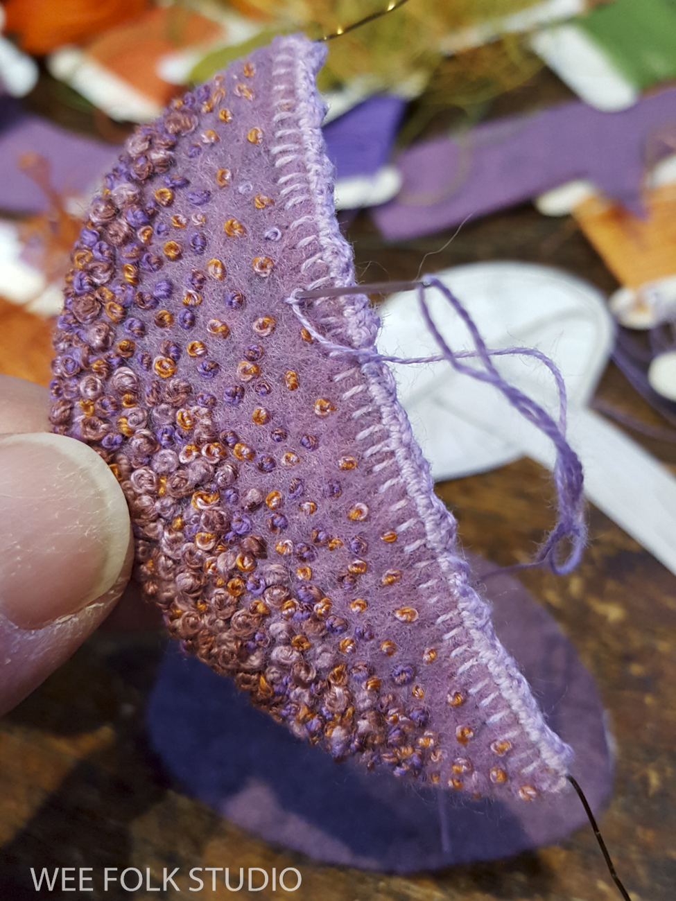 I sewed wire along the rim of the cap to help hold its curve. After covering the wire with stitches, I created an uneven edge with messy loops, so it would look more realistic. To make the bumpy texture on top, I stitched French knots with different shades of purple and orange embroidery floss.