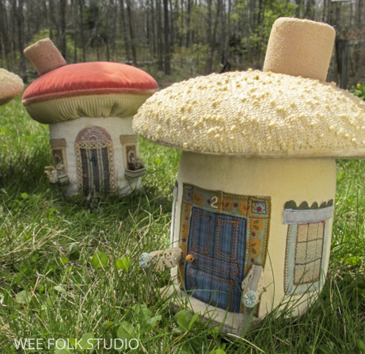 Toadstool mushrooms have popped out in my artwork for over 40 years. These are some mushroom houses I made in 1979, back when I used a sewing machine.