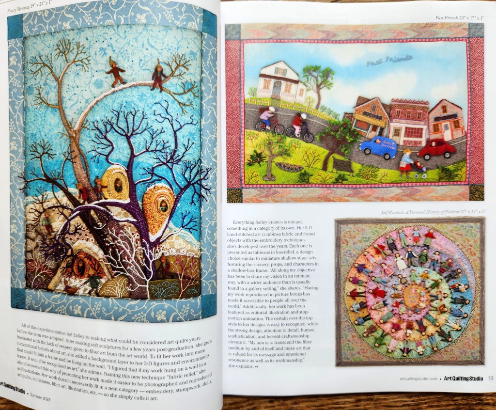 The summer issue of Art Quilting Studio features a 12-page artist portfolio about my work. I sent the editor a large selection of photos to choose from and to my surprise, they printed everything! The article covers a lot of ground and describes how and why I came to do what I do. I’m excited that more people will be seeing and learning about my artwork for the first time! This issue of the magazine can be purchased here.
