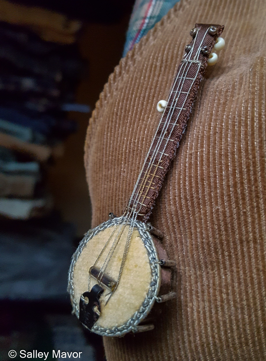 About 45 years ago, I made this banjo pin for Rob, which he keeps on a corduroy vest that I also made. The other day, I noticed that the banjo needed repair. The brackets around the drum had fallen off, so I replaced them with new tube beads that I still had in my stash. It was a simple and quick job that felt satisfying way longer than the time it took to do it!