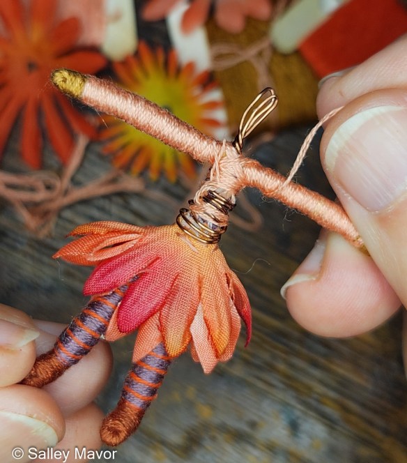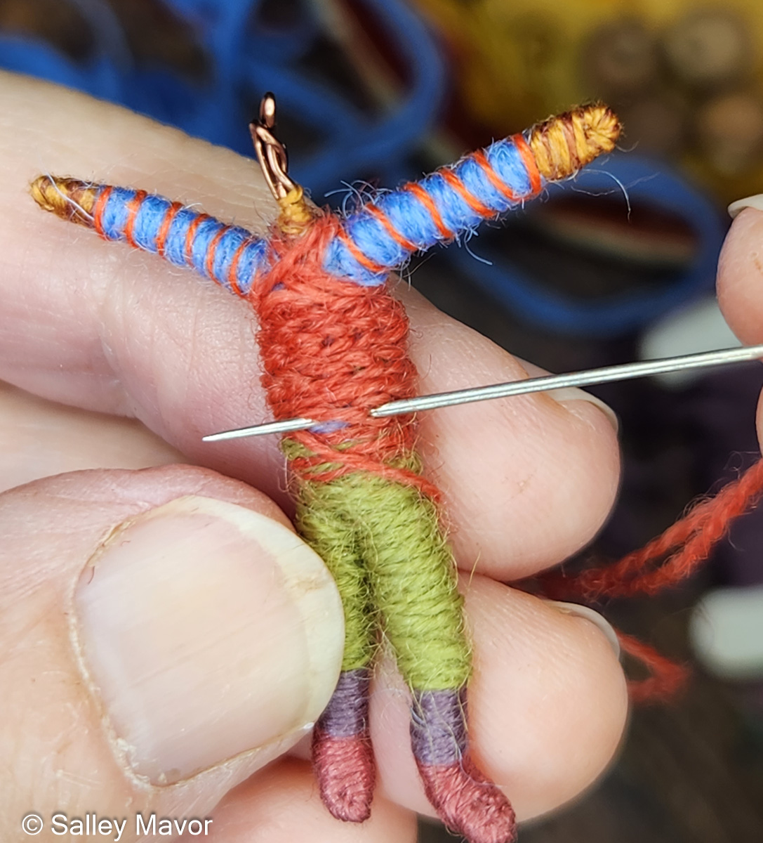 In the figure below, I used both cotton embroidery floss and tapestry yarn to wrap the wire armature. To give the illusion of a knitted vest, I chain stitched yarn around the torso.
