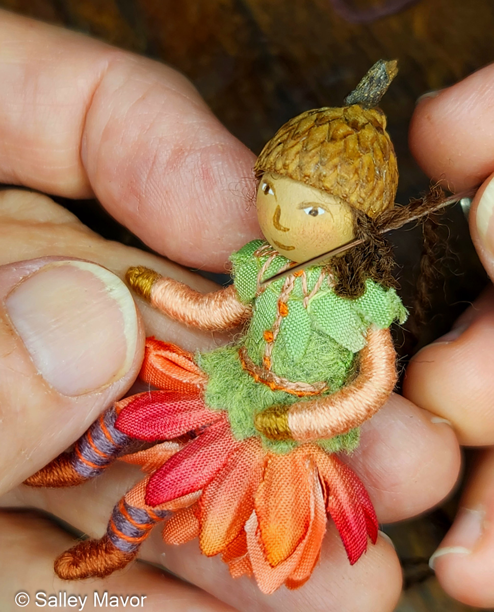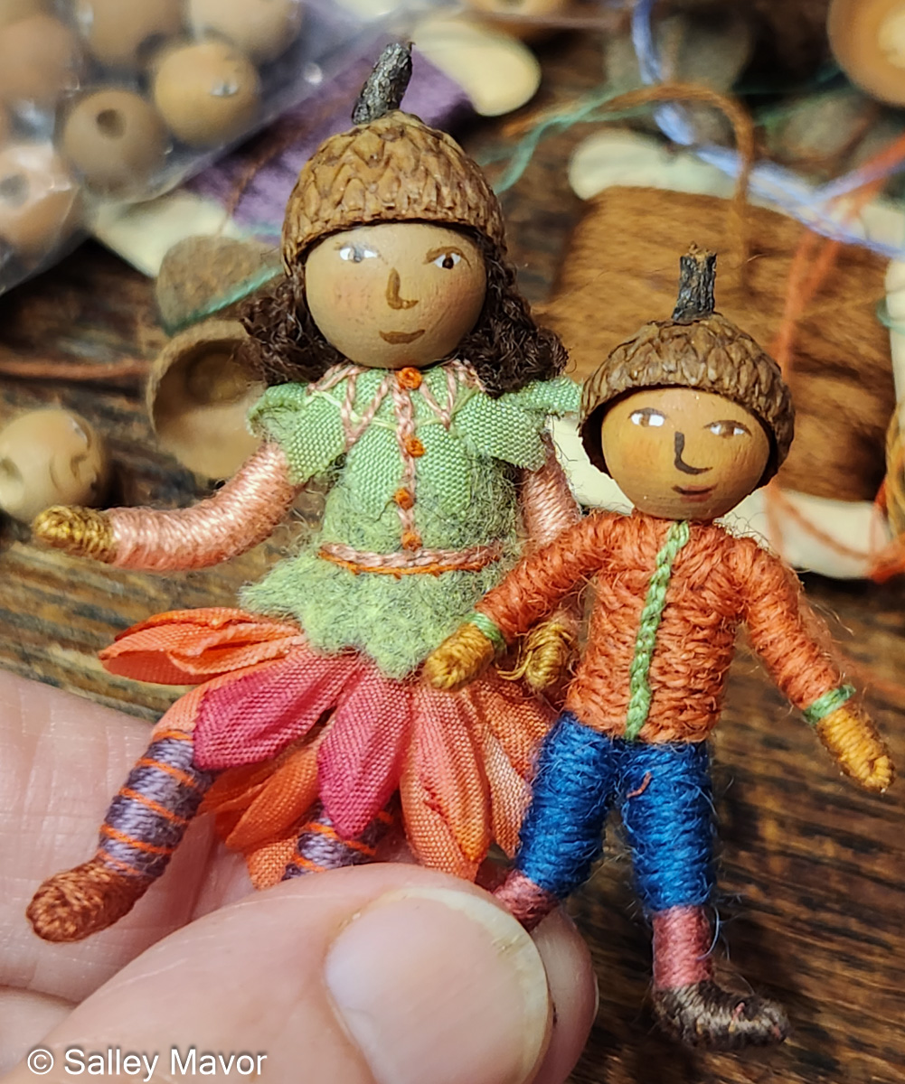 The figures are similar to the acorn-capped dolls described in my how-to book, Felt Wee Folk, only smaller in scale (1.5″ – 2″ tall).
