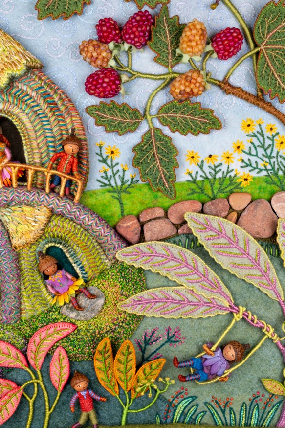 I hope that you’ve enjoyed learning about the making of Summertime. For a more comprehensive understanding of my process, I encourage you to explore previous posts in this series: Overview of the piece, Part 1 – Tree Trunks, Part 2 – Tree Houses, Part 3 – leaves, stems and branches, Part 4 – Baltimore Oriole (body), Part 5 – Baltimore Oriole (head and feet), Part 6 – rose vine, Part 7 – raspberry plants, Part 8 – stitching flora, and Part 9 – moss, sky and stone wall.