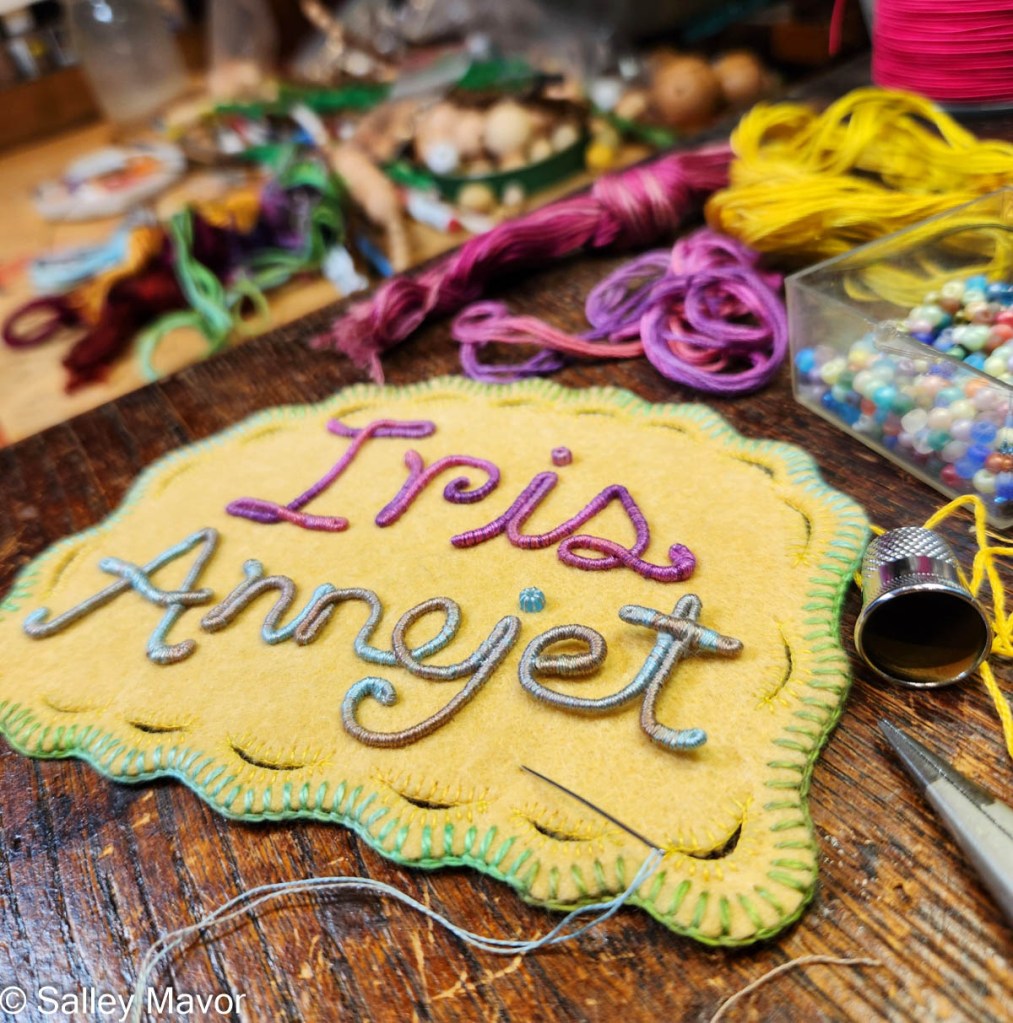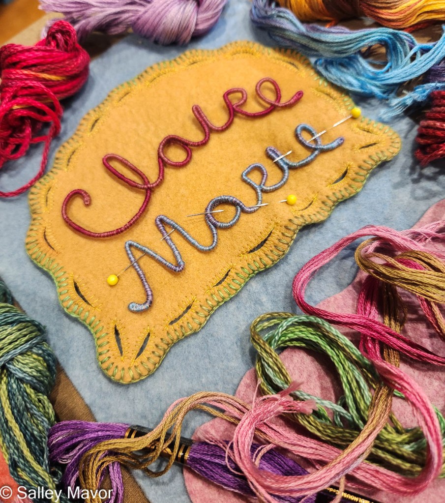 After choosing a color scheme and picking out pieces of felt and thread, I wrote out Laurel’s name in cursive handwriting with a pencil on paper. Fortunately, her name could be written in one continuous line, which doesn’t always happen. I then wrapped a length of DMC memory thread (a kind of wire) with 3 strands of variegated embroidery floss (see video below). Using the drawing as a template, I bent the wire to form her name and stitched the letters together where they touched.