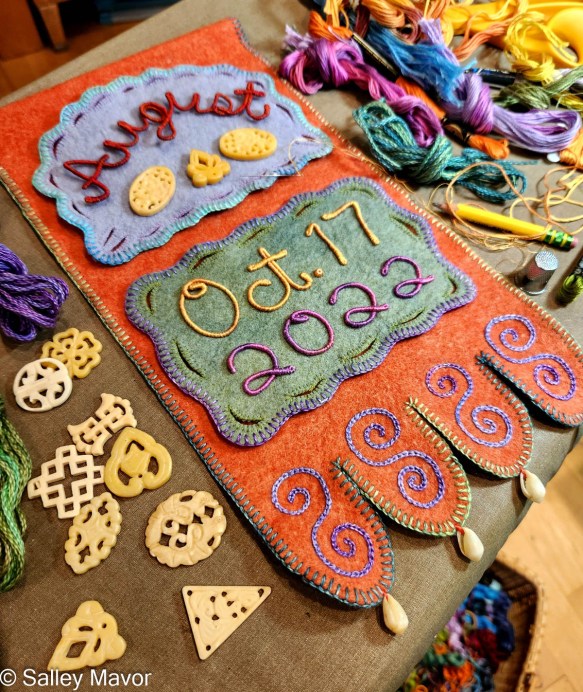 The bottom of the banner has three scalloped flaps that I embroidered with chained stitched spirals. At the bottom points, I sewed on some bone buttons that have been waiting a long time for the just the right purpose.