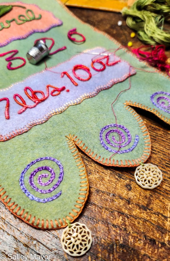 In the following video, I demonstrate wrapping DMC memory thread with 3 strands of embroidery floss to create letters for Laurel’s banner. Memory thread is wire coated with a fibrous material which is easier to grab onto than slippery wire. Wrapping the wire smoothly and evenly takes a lot of practice, so be patient. The wire ends are bent over and wrapped, so that no raw thread ends are hanging out. If you’ve learned to wrap arms and legs for the wee folk dolls in my how-to book, Felt Wee Folk, you’ve got a jump start on mastering this technique.
