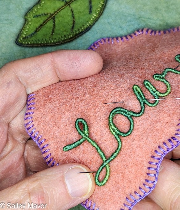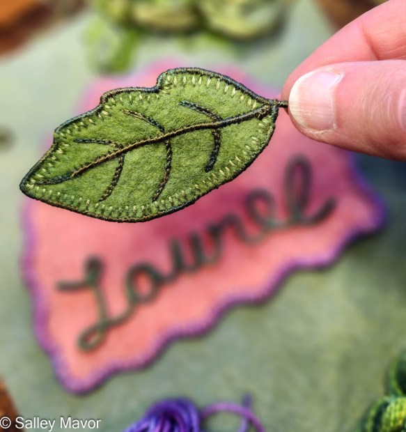 Adding a horticultural element to the banner was fun! I cut a laurel leaf shape out of wool felt and edged it with blanket stitching. Then I stitched wire around the outside edge of the leaf for stability. Jewelry wire works for this purpose, but for this project, I used some memory thread that was readily available on my table.