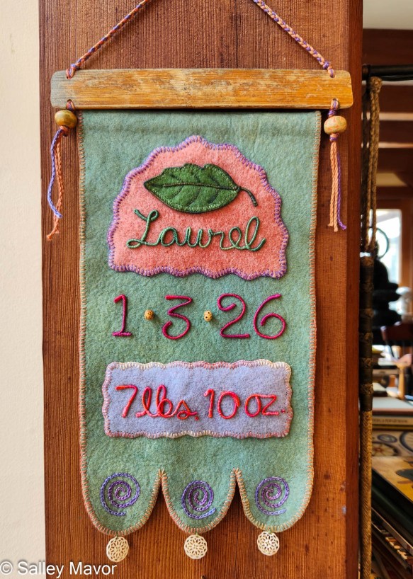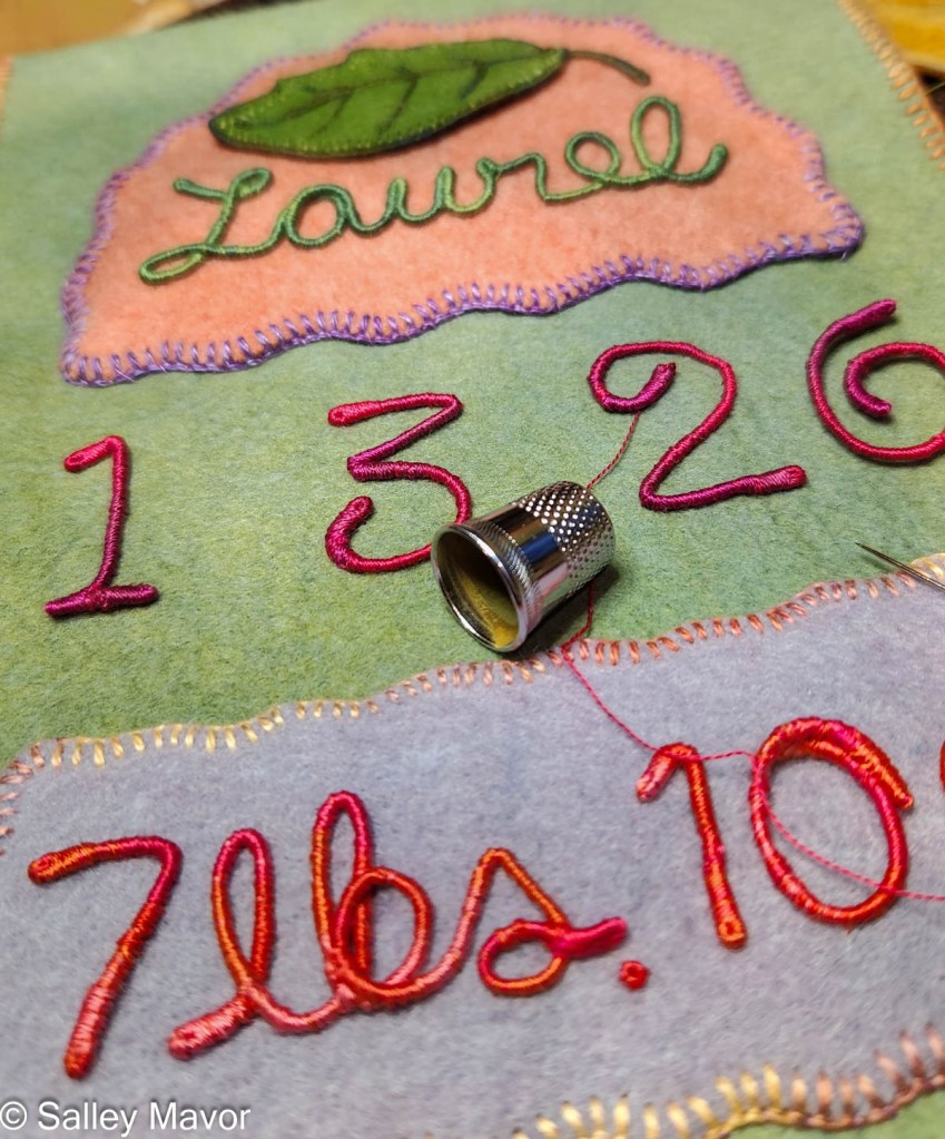For the past 20 years or so, I’ve made personalized gifts for friends and family to commemorate special events like weddings and births. These gifts take the form of felt banners or cake toppers. The embellished felt banners combine two of my favorite things, hand embroidery and cursive handwriting. In this post, I share a behind the scenes look at the process of making a baby banner for Laurel, who was born earlier this year. You can see posts about this and other banners by scrolling through the archives here. See wedding cake toppers here.