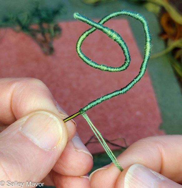 In the following video, you can see how I stitched memory thread (or wire) around the outside edges of the leaf. Then I created veins with wire and chain stitching.