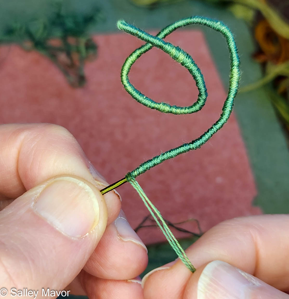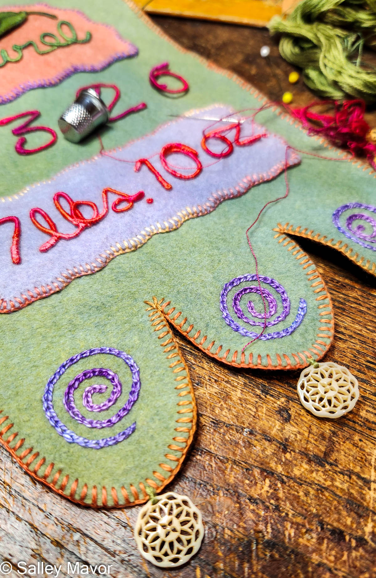 For these banners, I’ve routinely used variegated floss to wrap the wire that forms the lettering. I like how the changing shades look lively and naturalistic compared to plain solid colors.