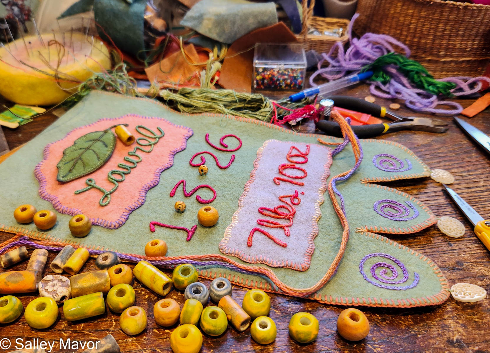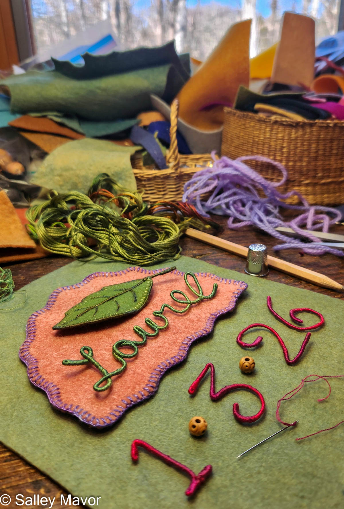 Adding a horticultural element to the banner was fun! I cut a laurel leaf shape out of wool felt and edged it with blanket stitching. Then I stitched wire around the outside edge of the leaf for stability. Jewelry wire works for this purpose, but for this project, I used some memory thread that was readily available on my table.