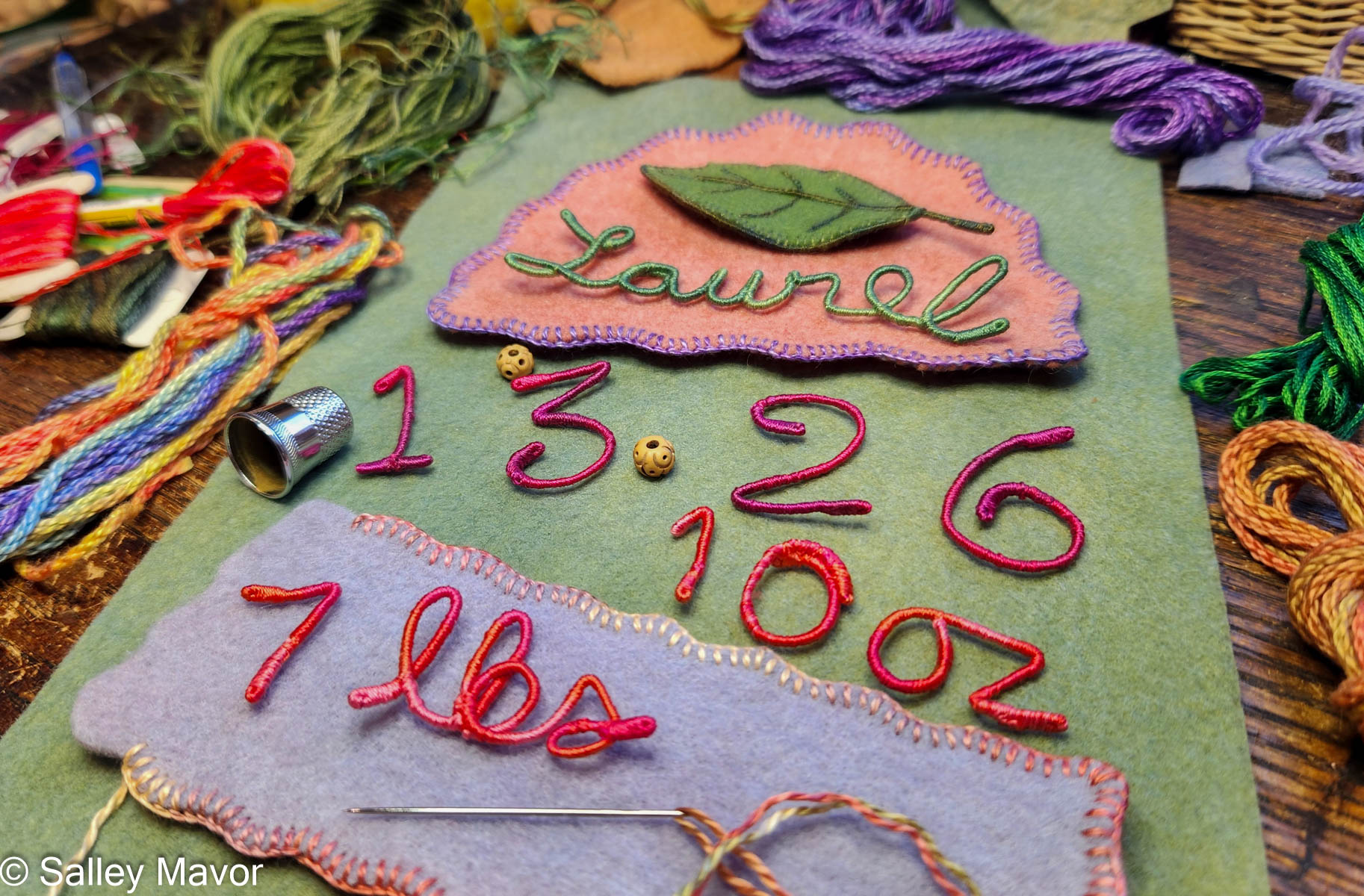 For the past 20 years or so, I’ve made personalized gifts for friends and family to commemorate special events like weddings and births. These gifts take the form of felt banners or cake toppers. The embellished felt banners combine two of my favorite things, hand embroidery and cursive handwriting. In this post, I share a behind the scenes look at the process of making a baby banner for Laurel, who was born earlier this year. You can see posts about this and other banners by scrolling through the archives here. See wedding cake toppers here.