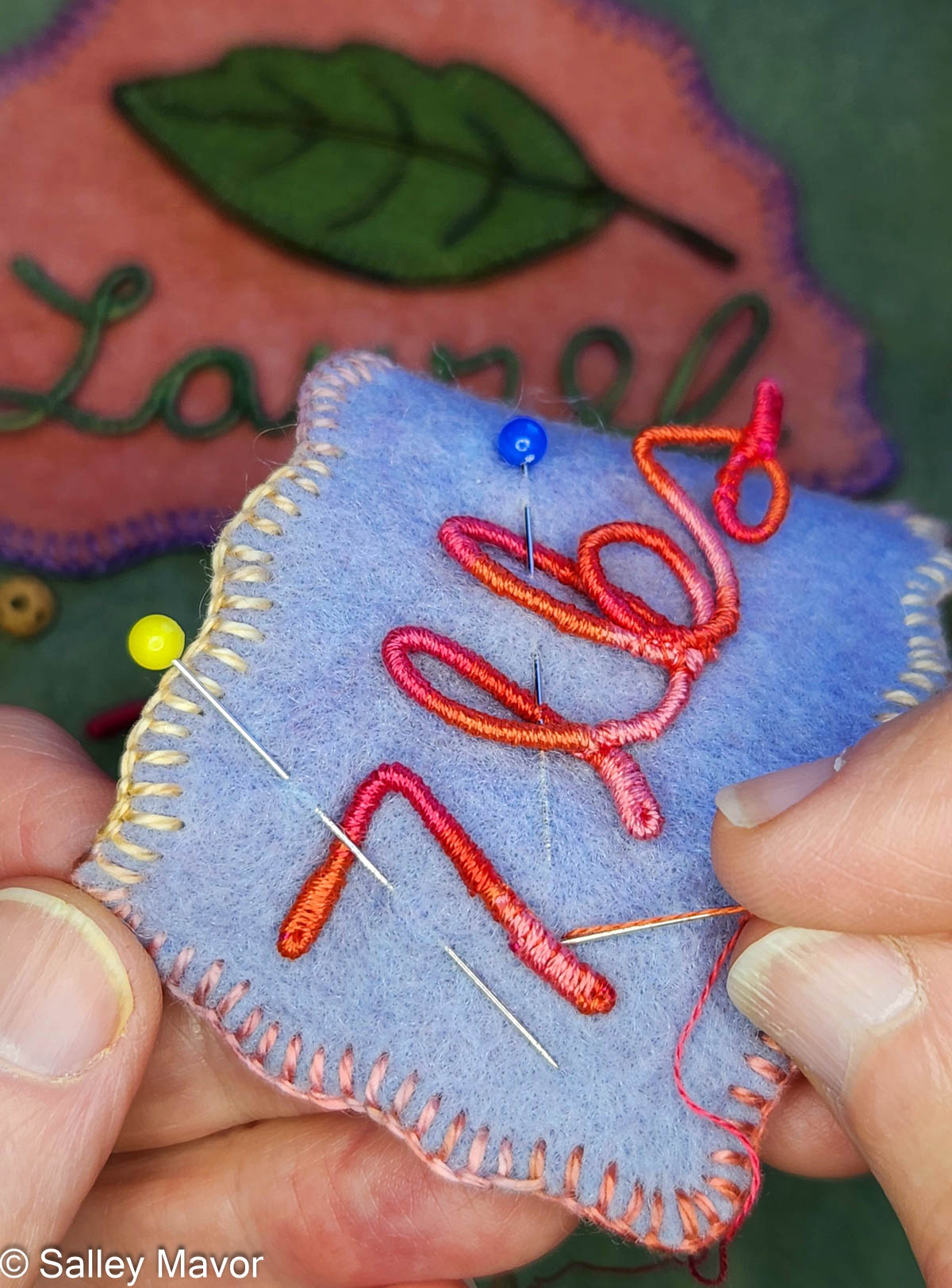 After choosing a color scheme and picking out pieces of felt and thread, I wrote out Laurel’s name in cursive handwriting with a pencil on paper. Fortunately, her name could be written in one continuous line, which doesn’t always happen. I then wrapped a length of DMC memory thread (a kind of wire) with 3 strands of variegated embroidery floss (see video below). Using the drawing as a template, I bent the wire to form her name and stitched the letters together where they touched.