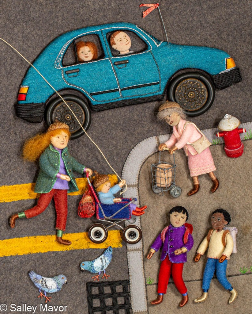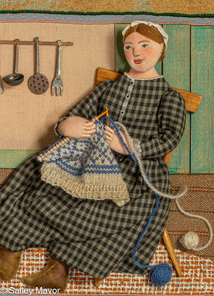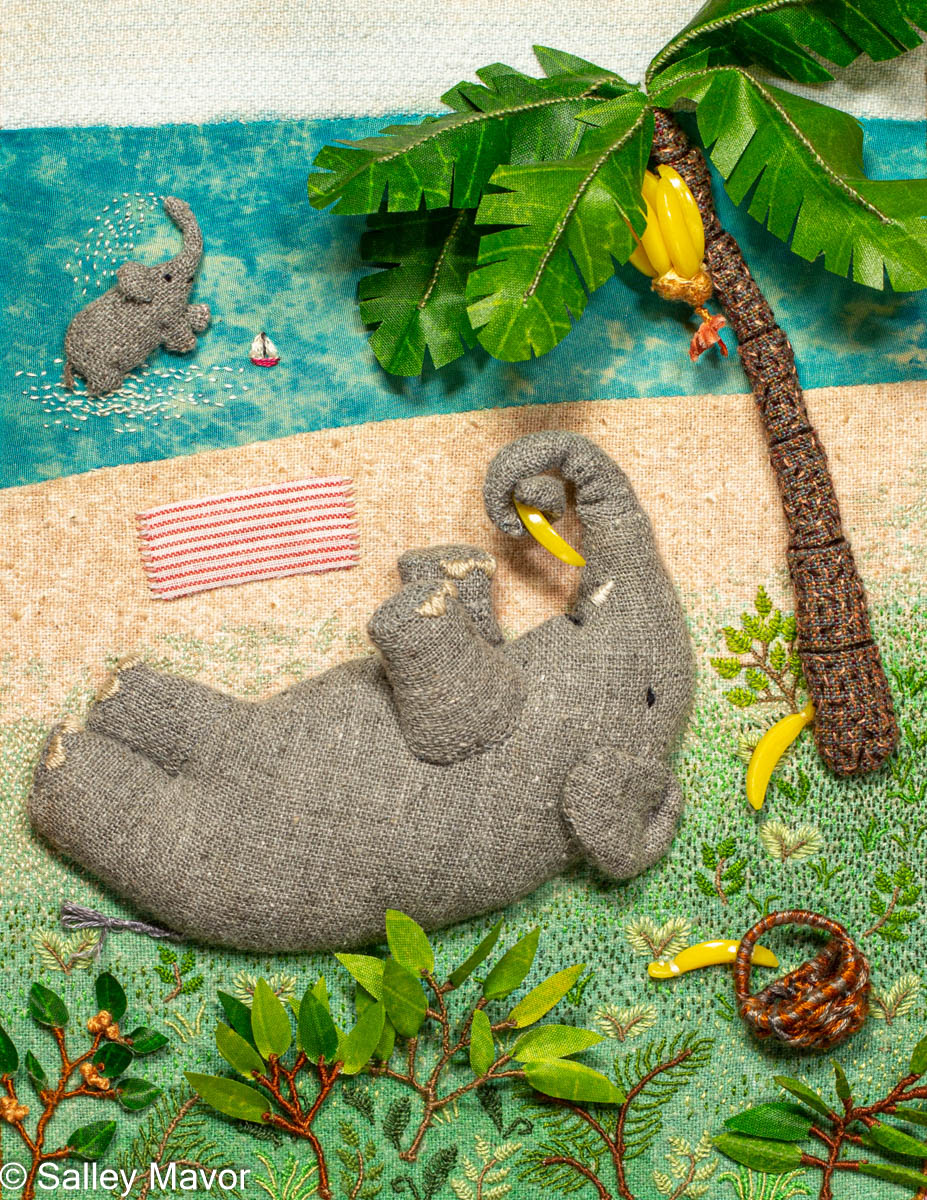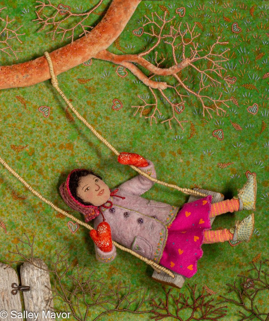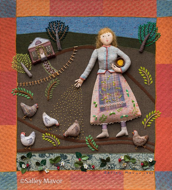 While my artwork was inspired by stumpwork, my techniques, materials, subject matter, and presentation were entirely different. Even if I could have found instructional materials for learning traditional techniques from the 17th century, I doubt I would have had the tolerance to follow the patterns and directions as prescribed. My creative process has always been more self-guided, involving a lot of experimentation until I discover something that works. When asked what my medium was called, I hesitated to use the term “stumpwork”, concerned that it sounded too homely. I soon labeled my new work ”fabric relief”, a name that I thought more accurately described my art.