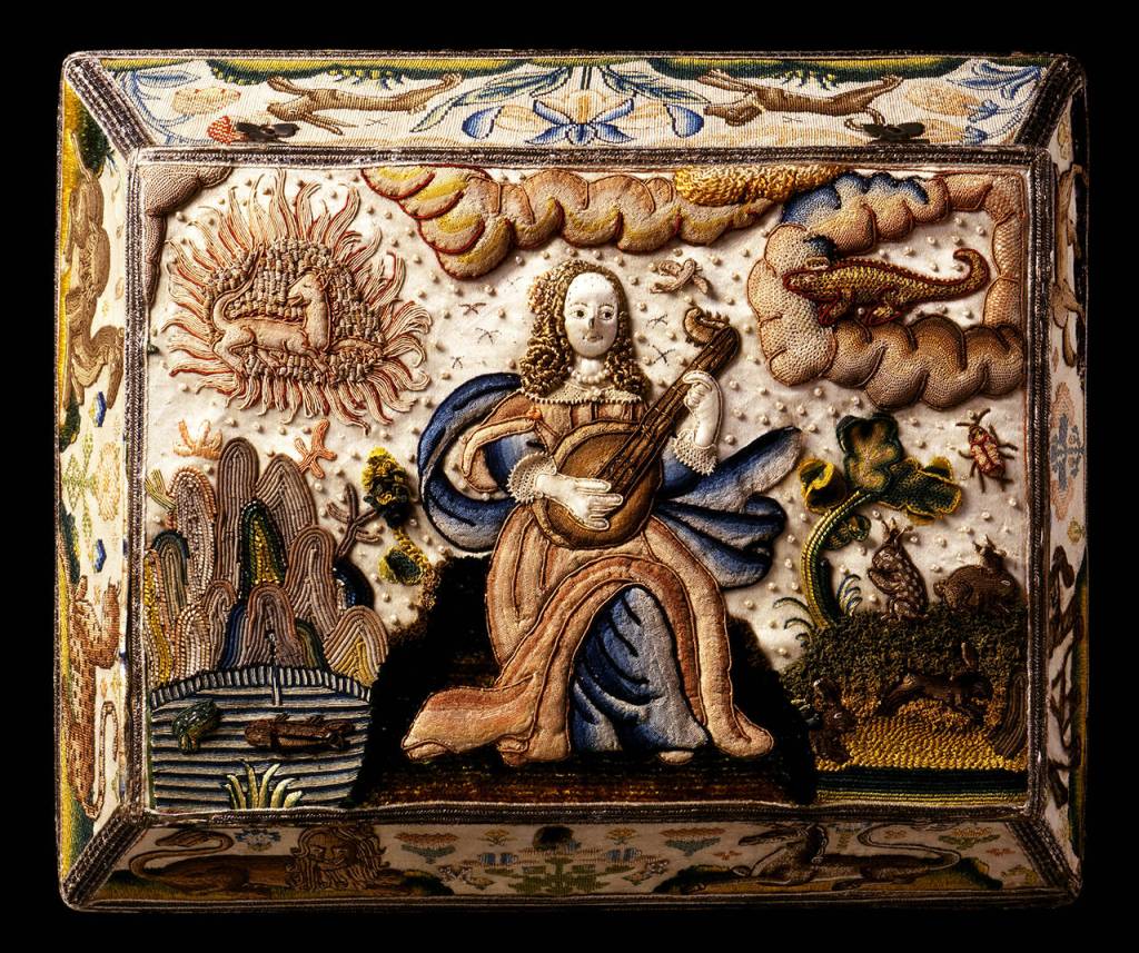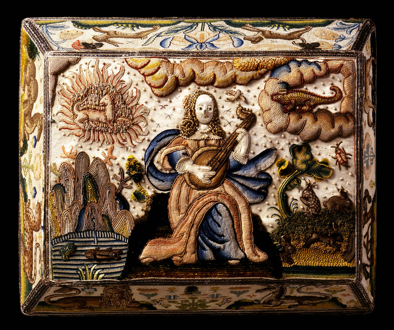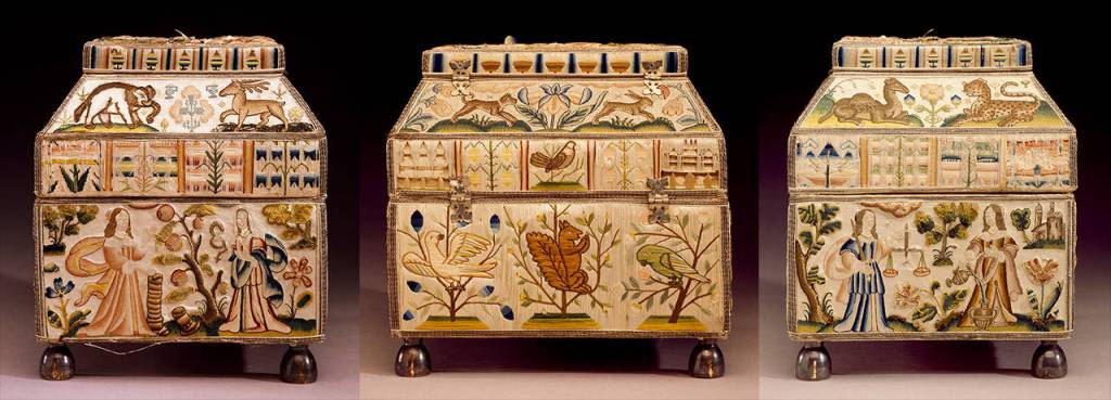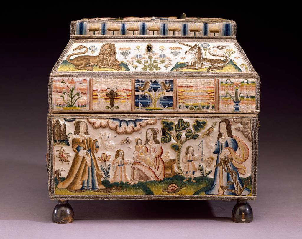 This stumpwork casket is in a collection of embroideries at the Victoria and Albert Museum in London. It was made by Martha Eldin in 1671, when she was just 11 years old! The V & A’s website shares this bit of history about Martha’s casket: “Caskets like Martha’s were produced in England between about 1650 and 1695. The decorative needlework panels were worked by young girls as part of their needlework education.”