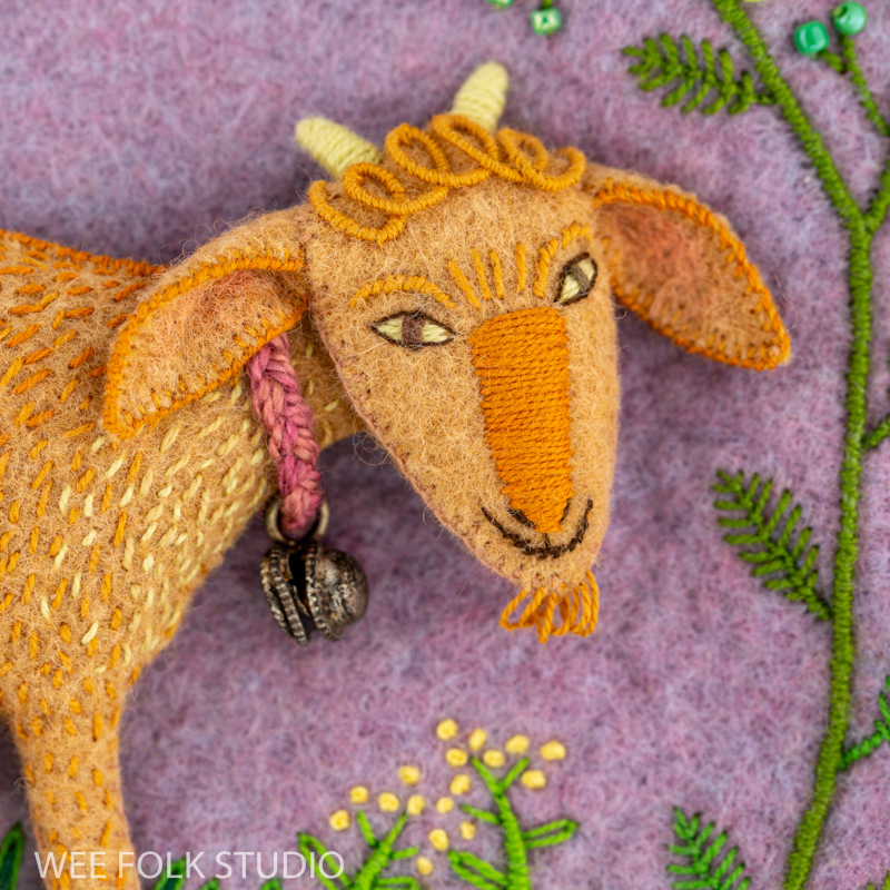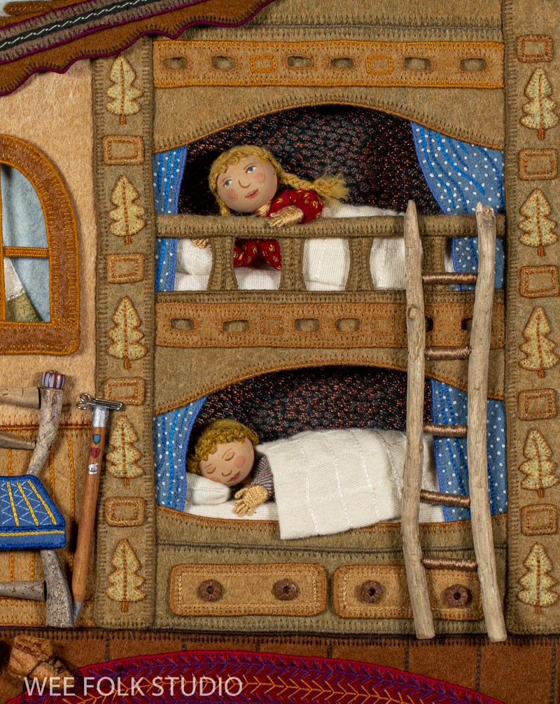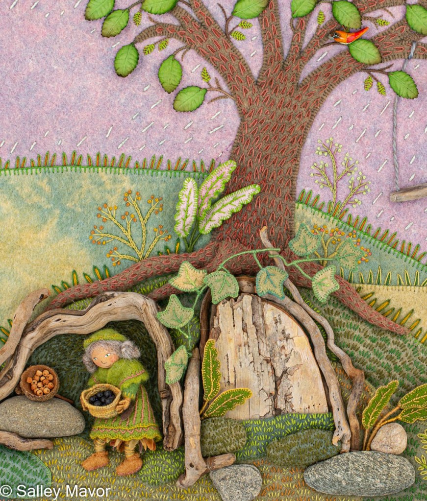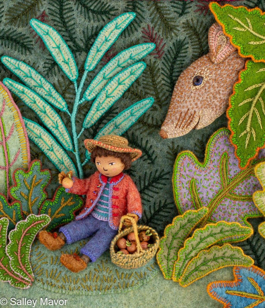 Fascinated by the three-dimensional aspect of stumpwork and its storytelling potential, I was eager to adapt the concept in a way that matched my own artistic style and abilities. Unlike other textile processes with pre-planned designs or grids—essentially functioning as color-by-number projects—stumpwork allowed ample wiggle room to make changes as I worked. This freedom to manipulate and rearrange parts midstream made this method especially appealing to me, as I typically began with a simple sketch and refined my work as I progressed.