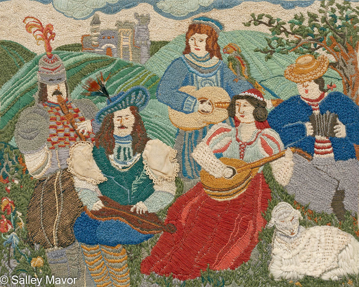 In 1975, just before discovering stumpwork, I embroidered Old World Musicians for an illustration class. At the time, I was already interested in pictorial subjects and enjoyed experimenting with various textural embellishments in my work. However, seeing examples of stumpwork opened my eyes even further to the creative opportunities within needlework.