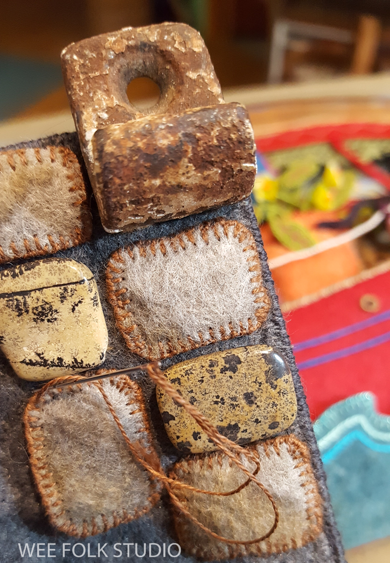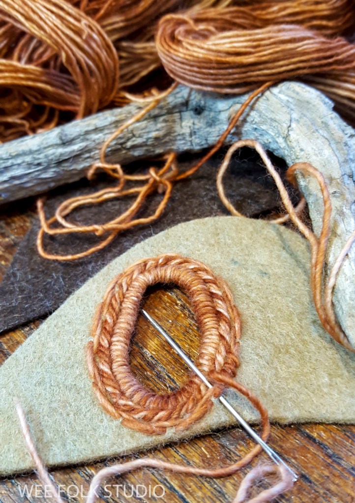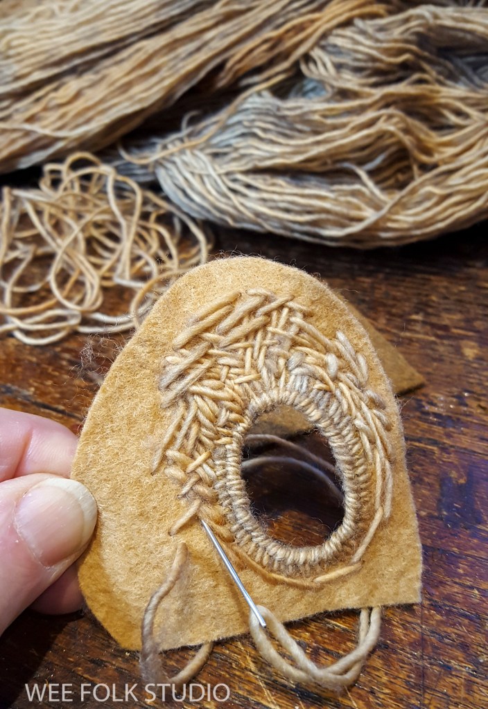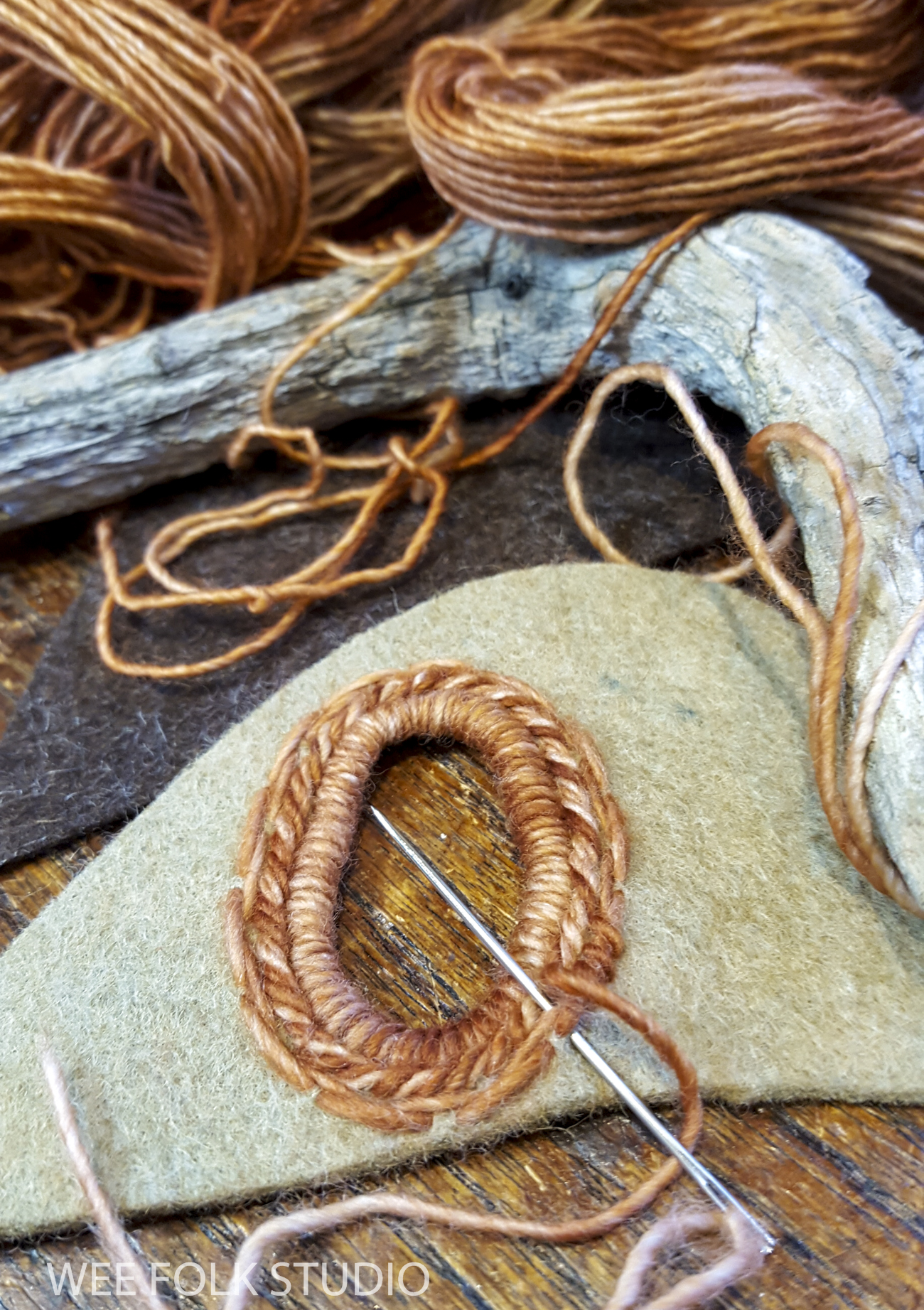 I used wool tapestry yarn or mending wool to stitch and wrap their winter clothing. Whenever I share photos showing dolls wearing sweaters, people actually think I knit them! For something this small it’s much easier to create the allusion of knitting with rows of chain stitches. For other examples of faux knitted outfits, see Polly Doll‘s Irish knit sweater here and her Fair Isle vest here.