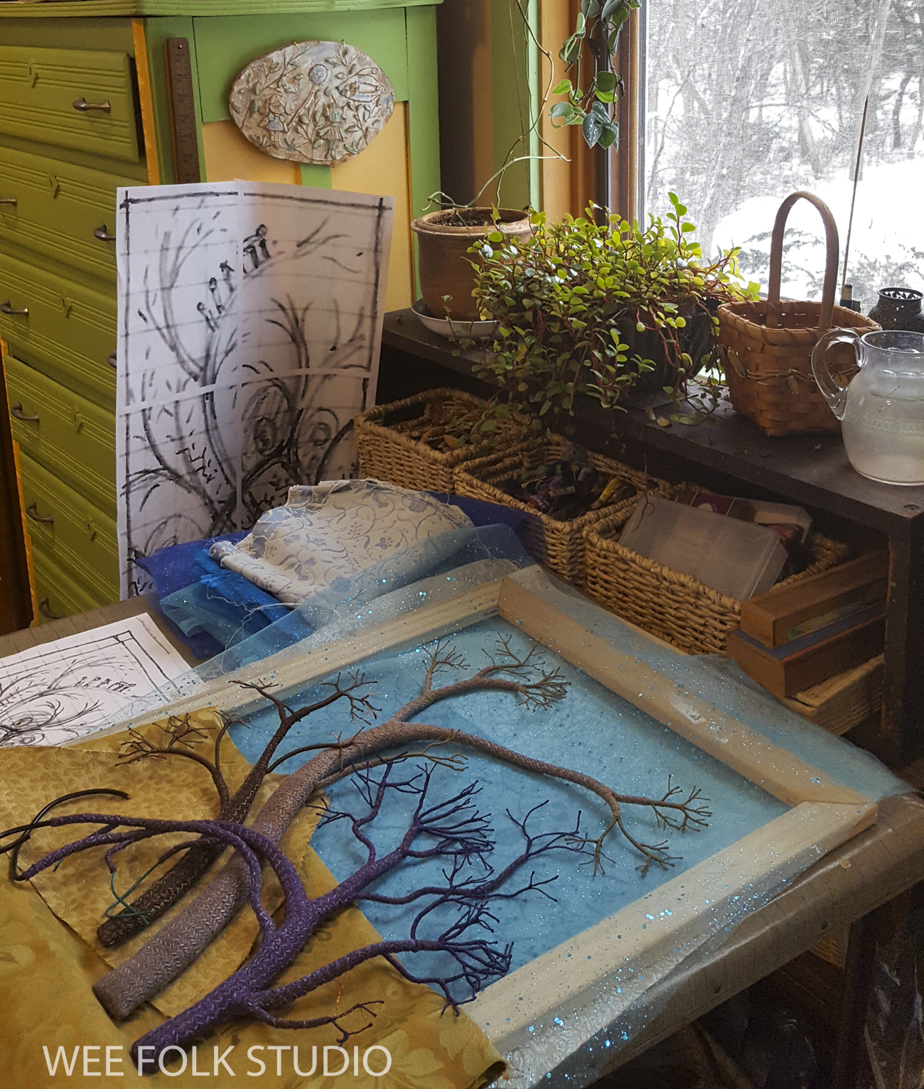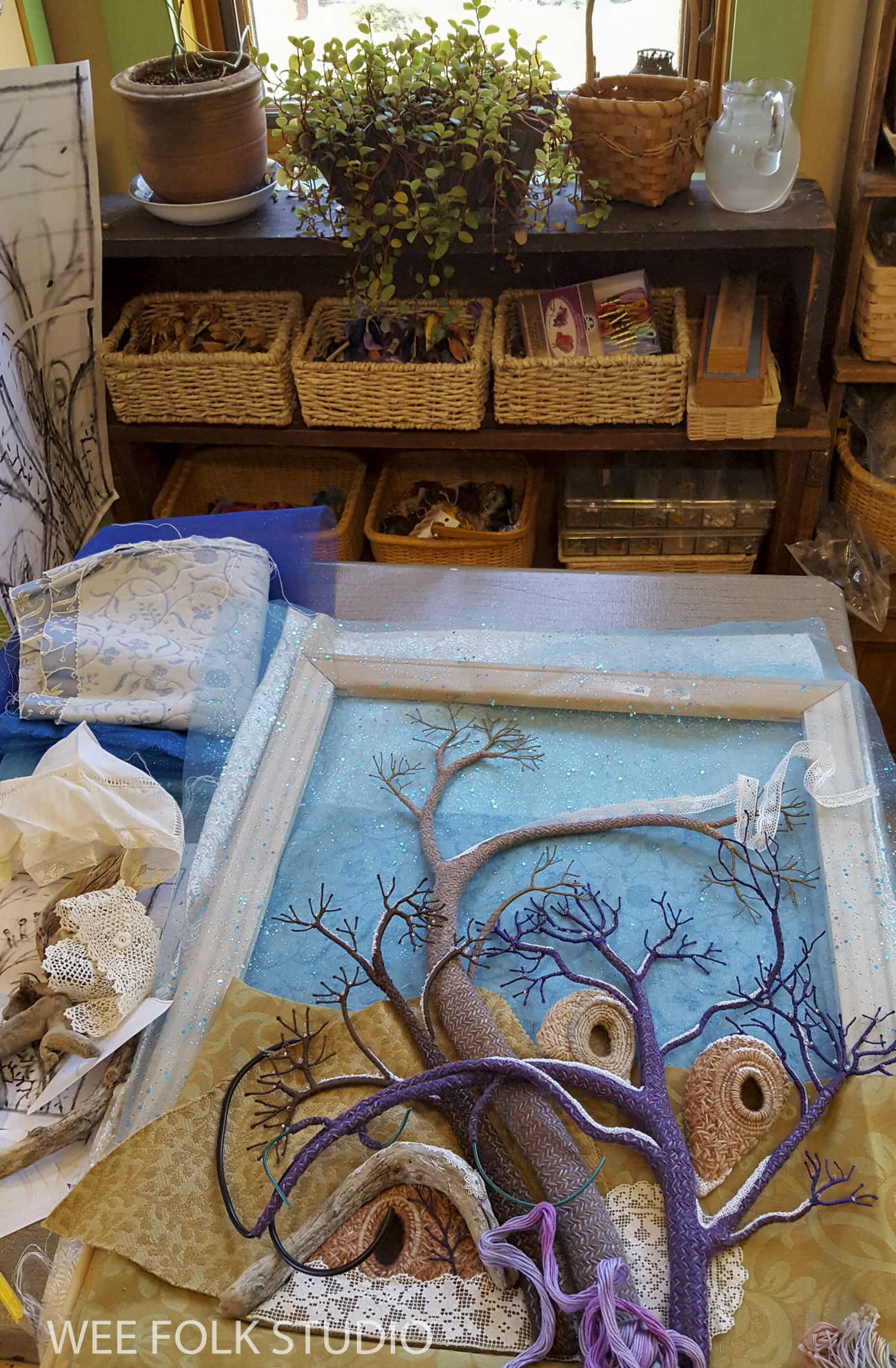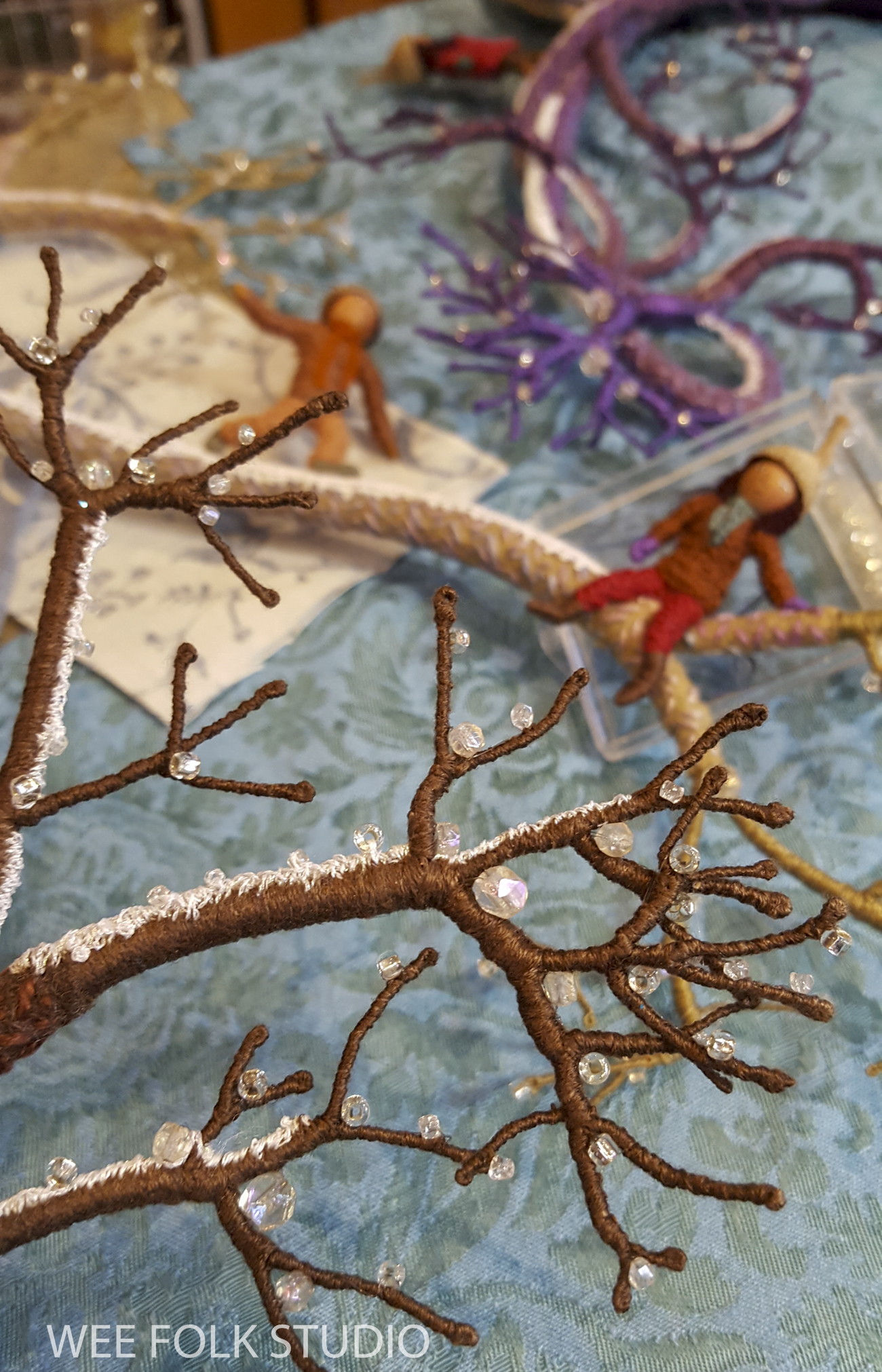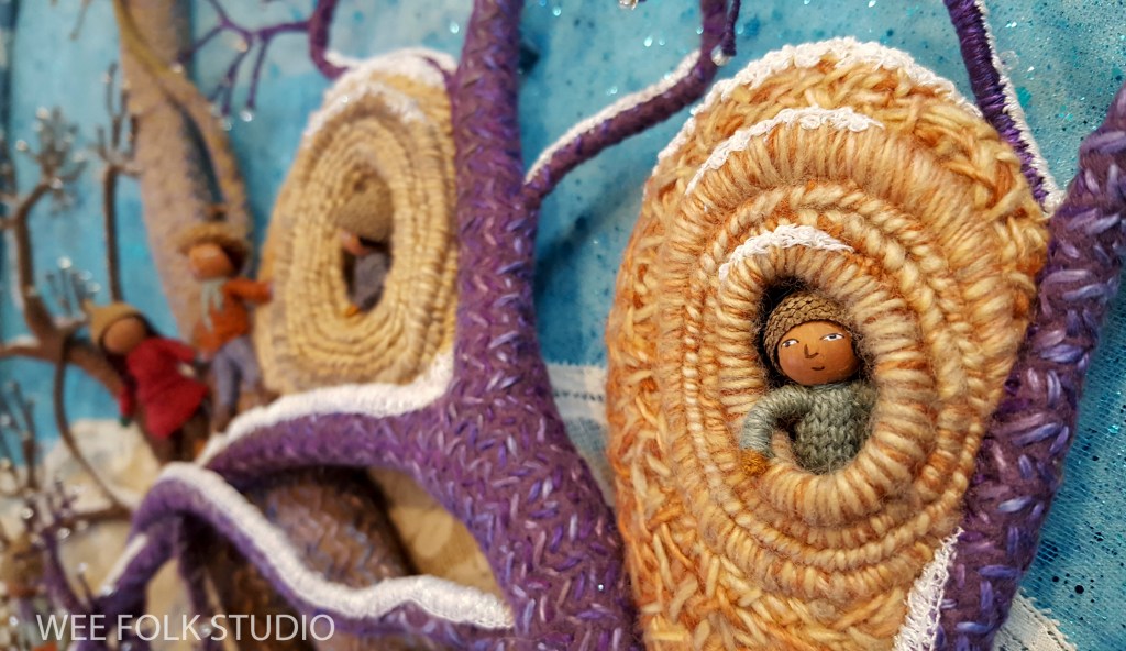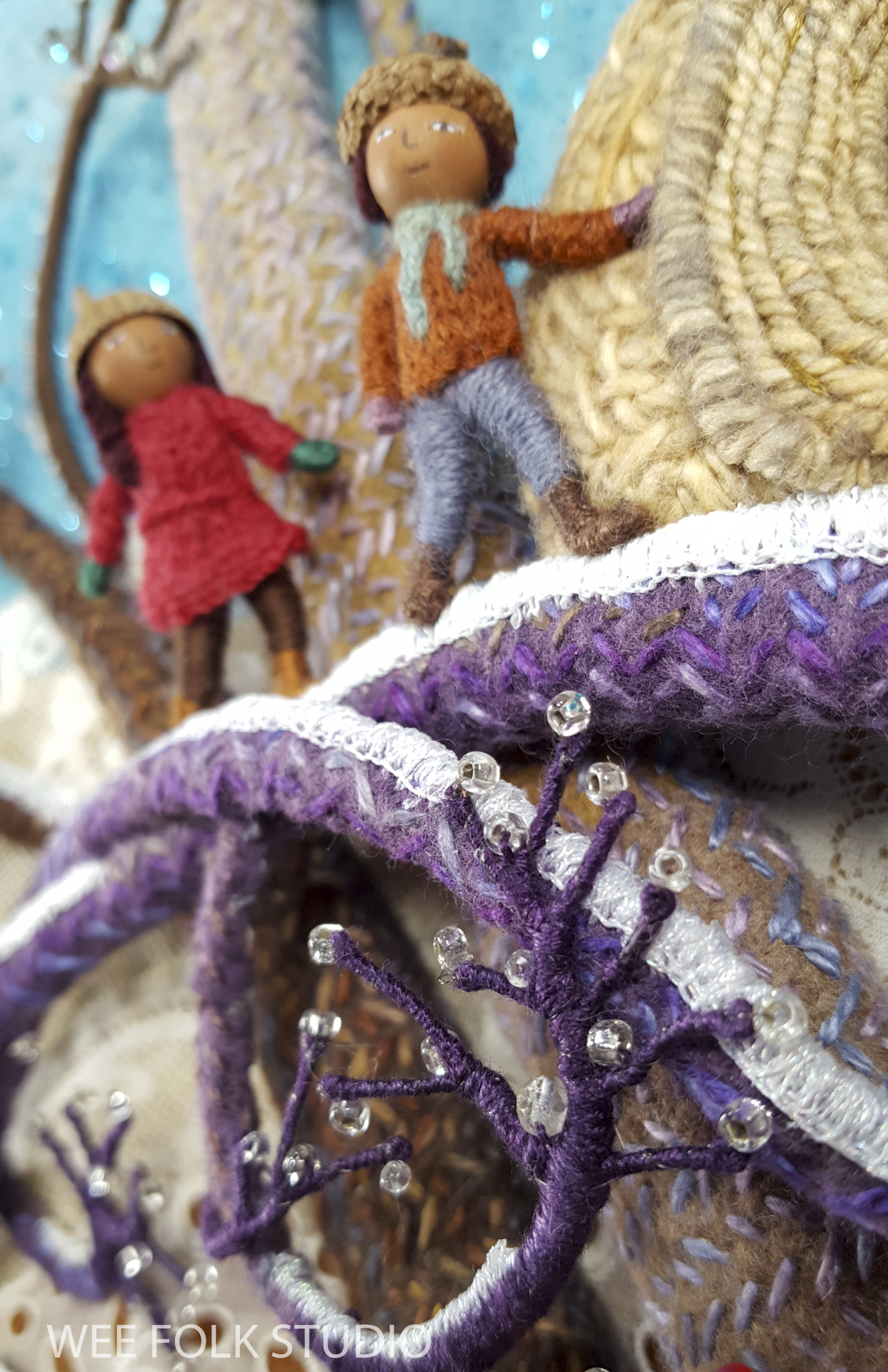 This 6th and final part in the Frosty Morning series is about making the wee folk characters who live in the winter landscape. All of the other stuff, the trees, the icy snow cover and the sparkling sky are just meant to set the stage for the little people to frolic in. While I worked on this piece, I thought about what the wee folk would look like and what they would be doing. Adding a narrative element with human (or animal) faces helps me fall in love with what I’m making. The scenery may be lovely, but without play actors, there is no story. And without that, what’s the point?