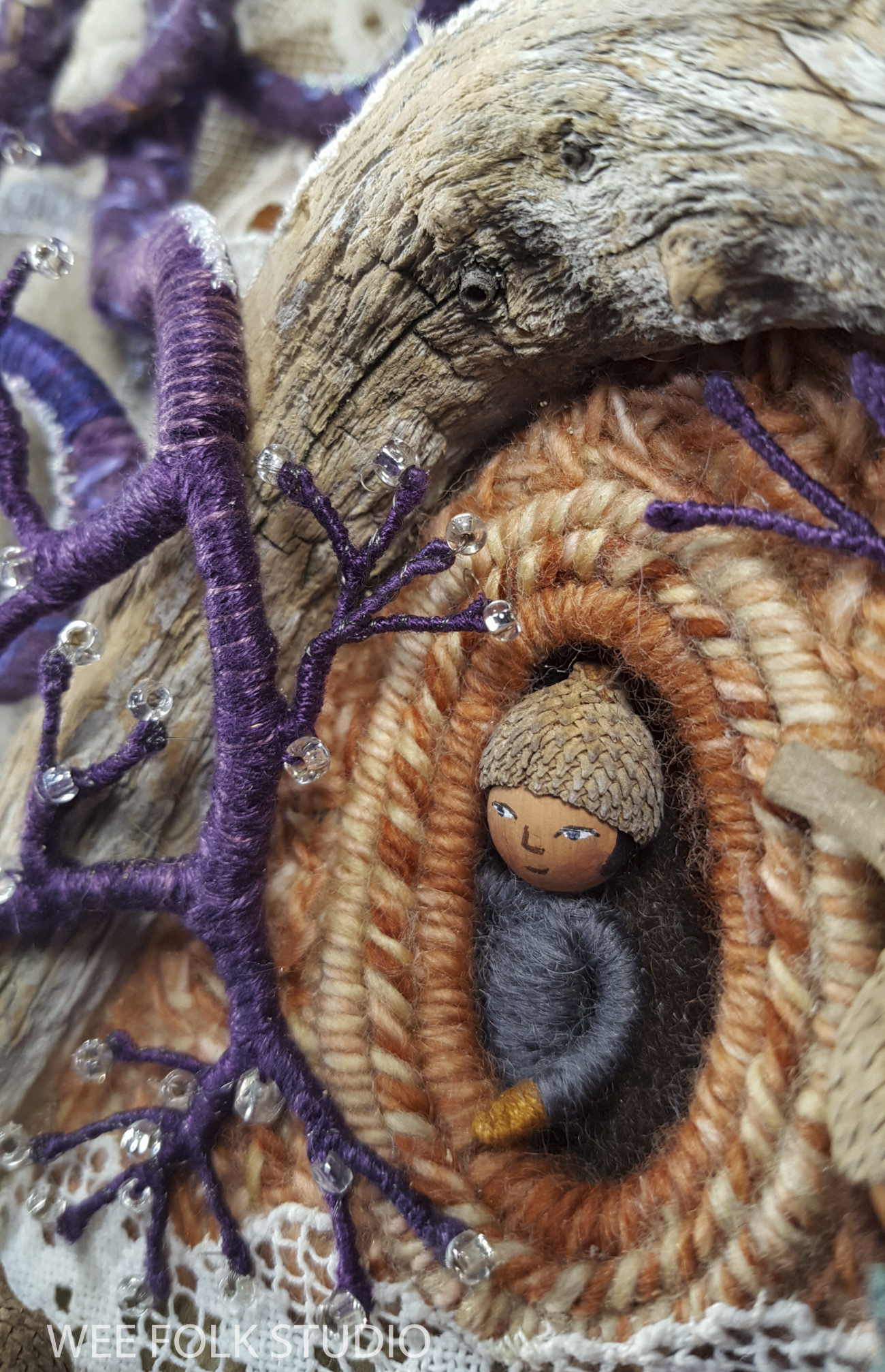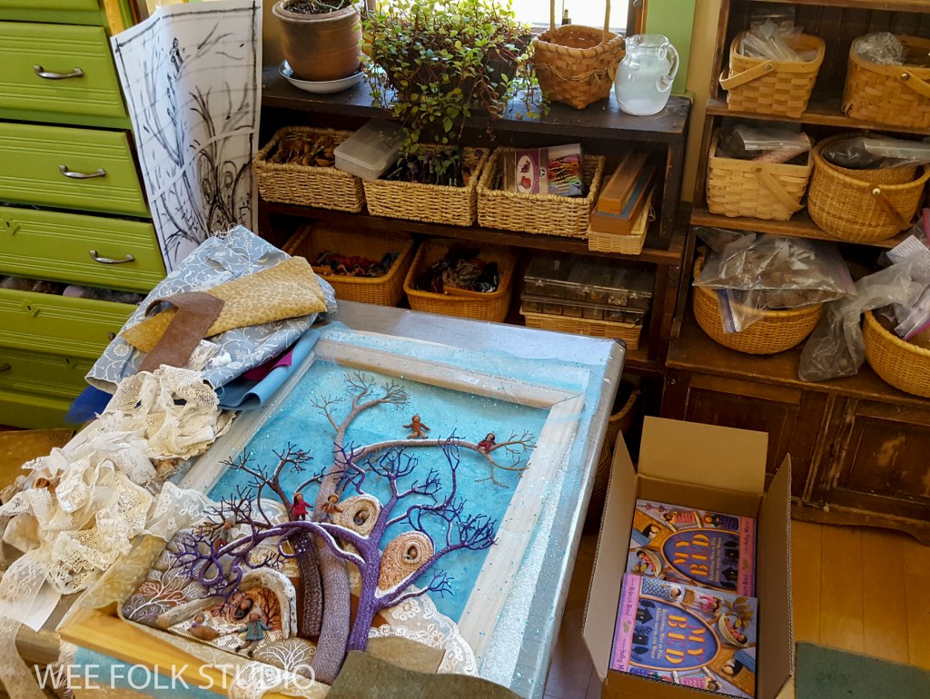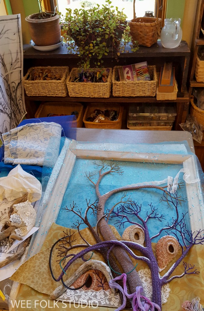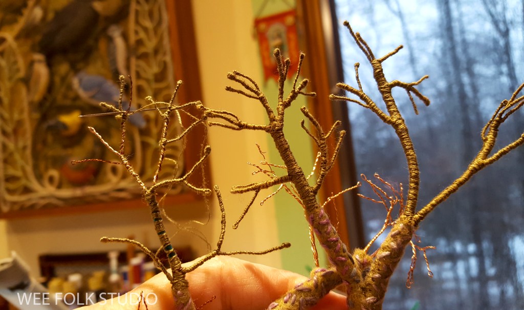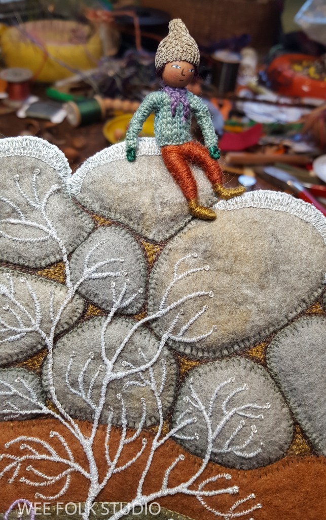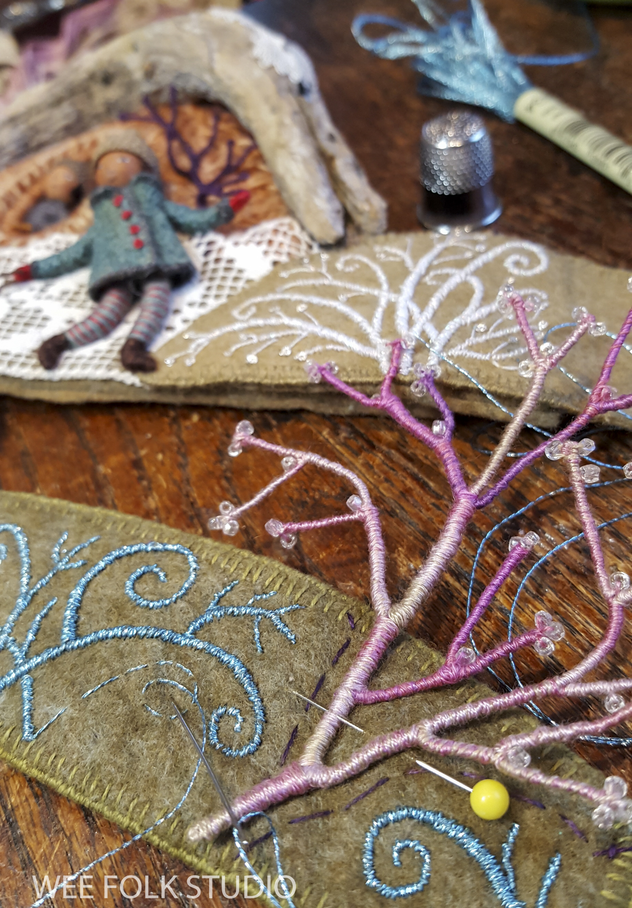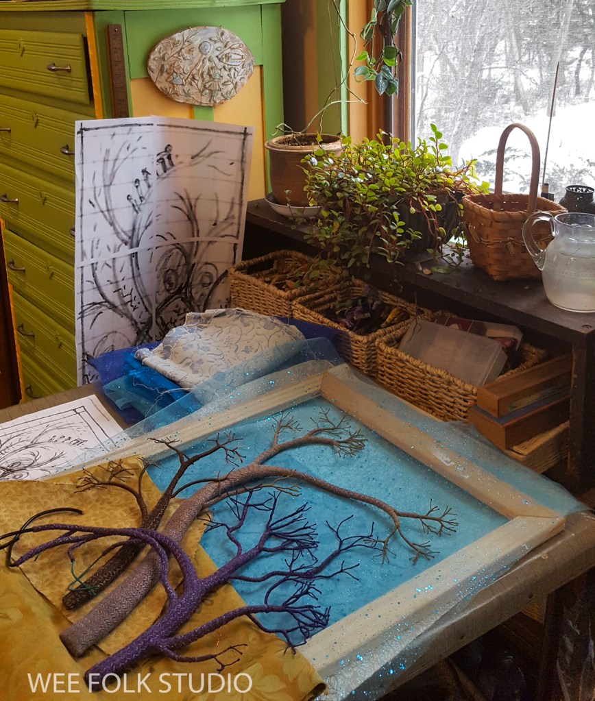 This 6th and final part in the Frosty Morning series is about making the wee folk characters who live in the winter landscape. All of the other stuff, the trees, the icy snow cover and the sparkling sky are just meant to set the stage for the little people to frolic in. While I worked on this piece, I thought about what the wee folk would look like and what they would be doing. Adding a narrative element with human (or animal) faces helps me fall in love with what I’m making. The scenery may be lovely, but without play actors, there is no story. And without that, what’s the point?
