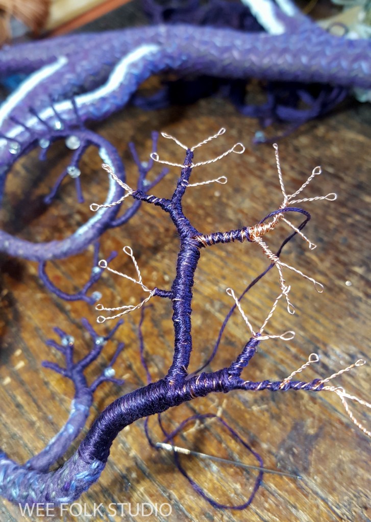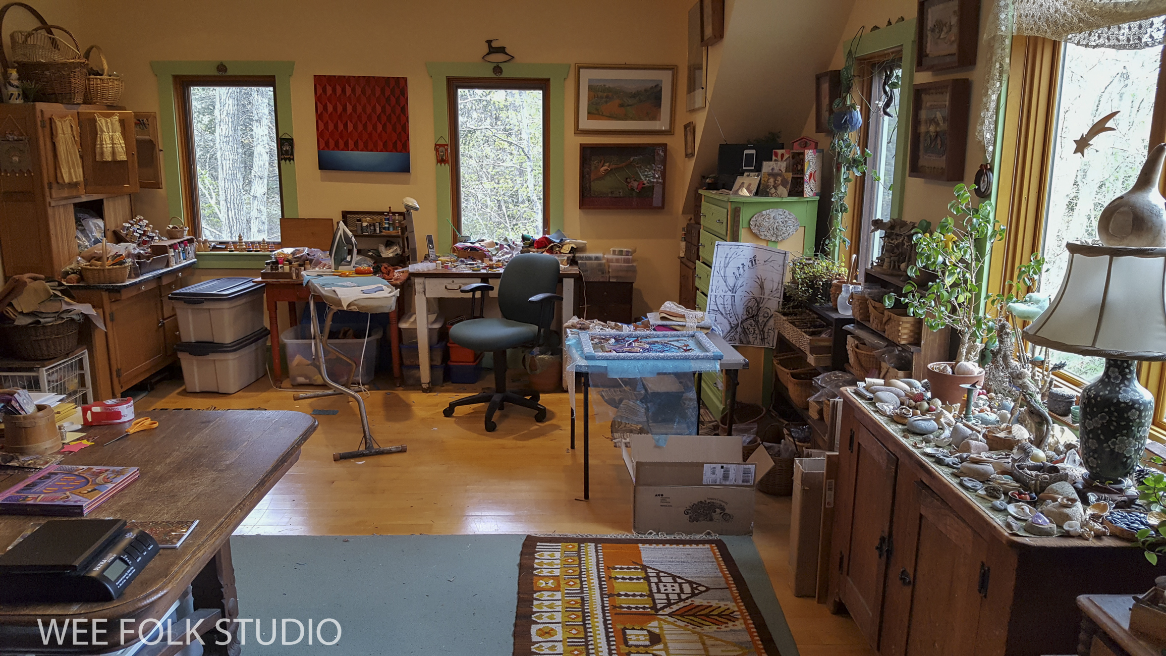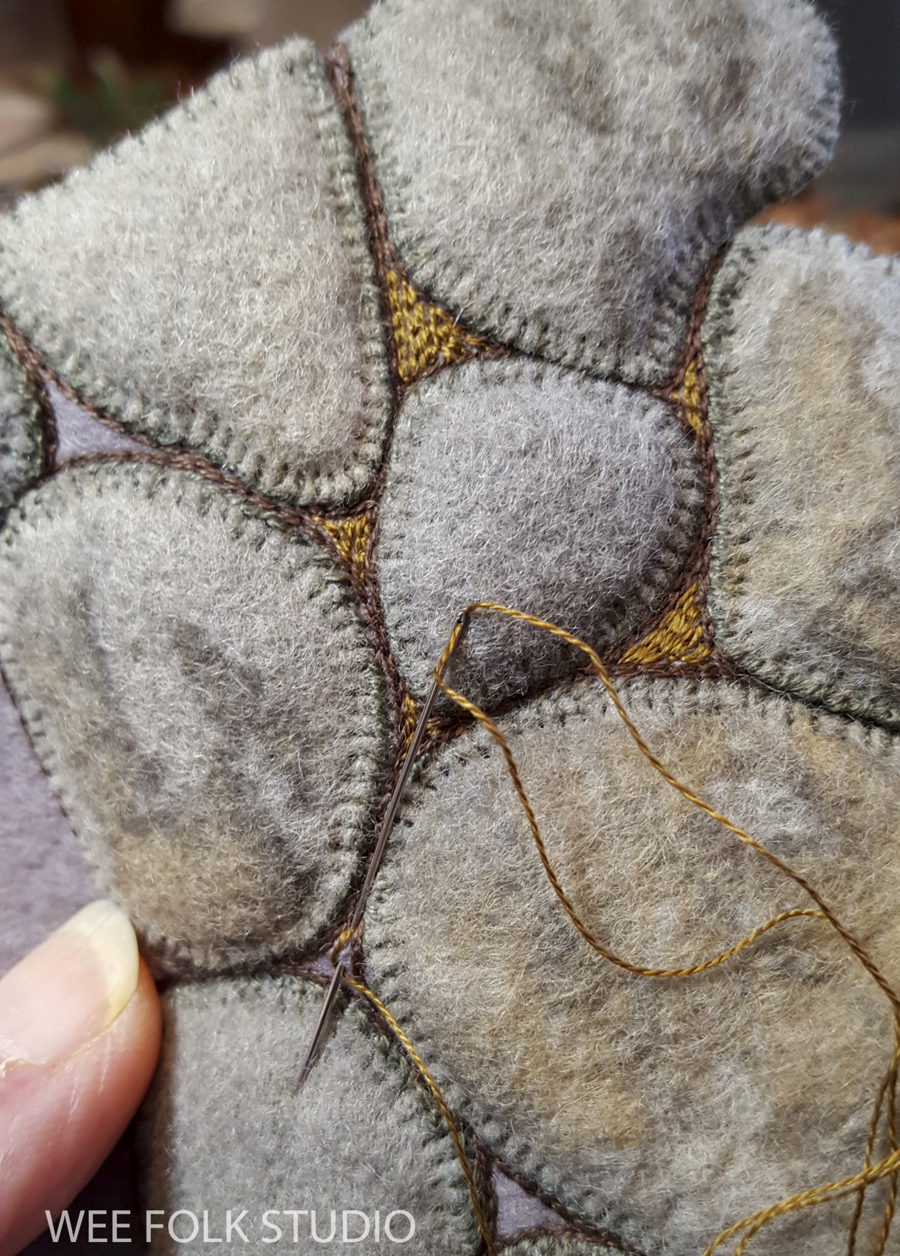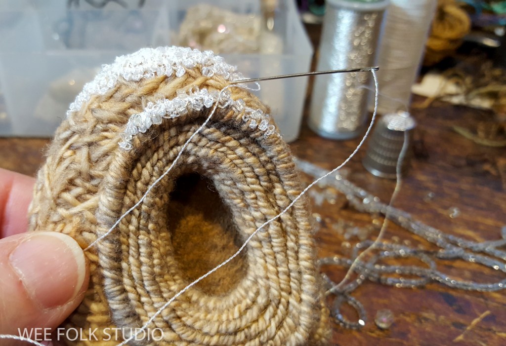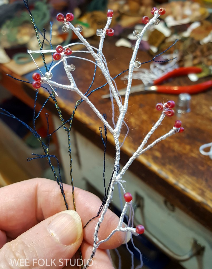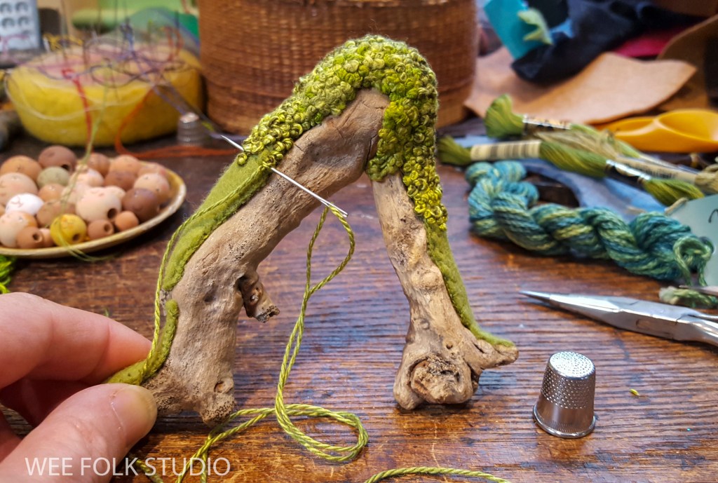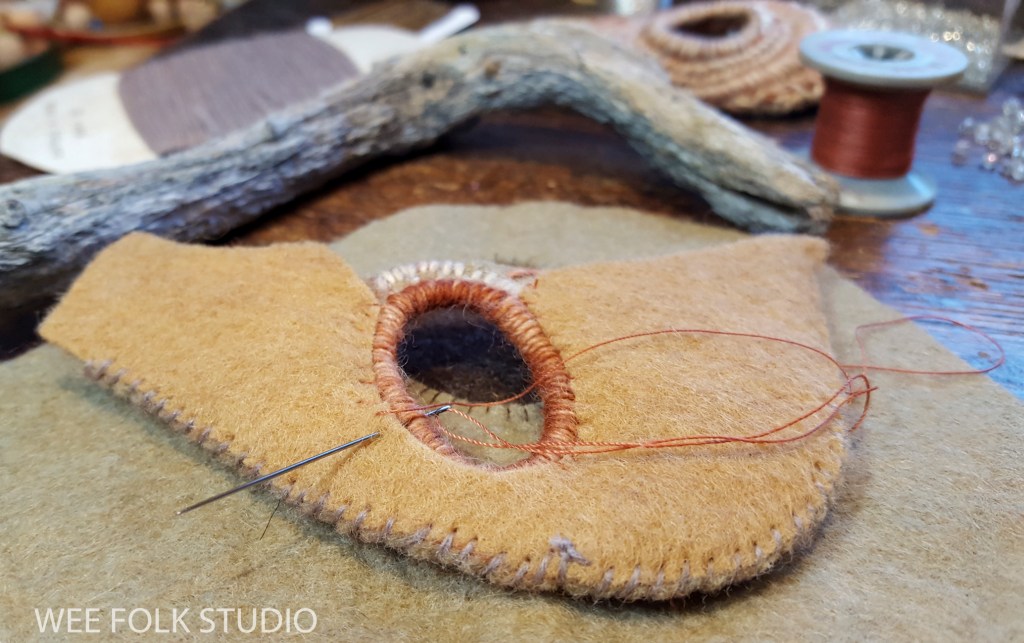 This 6th and final part in the Frosty Morning series is about making the wee folk characters who live in the winter landscape. All of the other stuff, the trees, the icy snow cover and the sparkling sky are just meant to set the stage for the little people to frolic in. While I worked on this piece, I thought about what the wee folk would look like and what they would be doing. Adding a narrative element with human (or animal) faces helps me fall in love with what I’m making. The scenery may be lovely, but without play actors, there is no story. And without that, what’s the point?