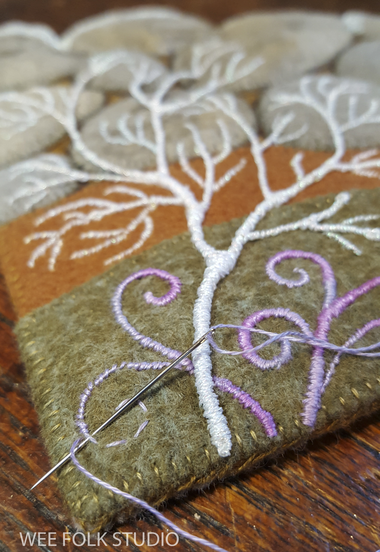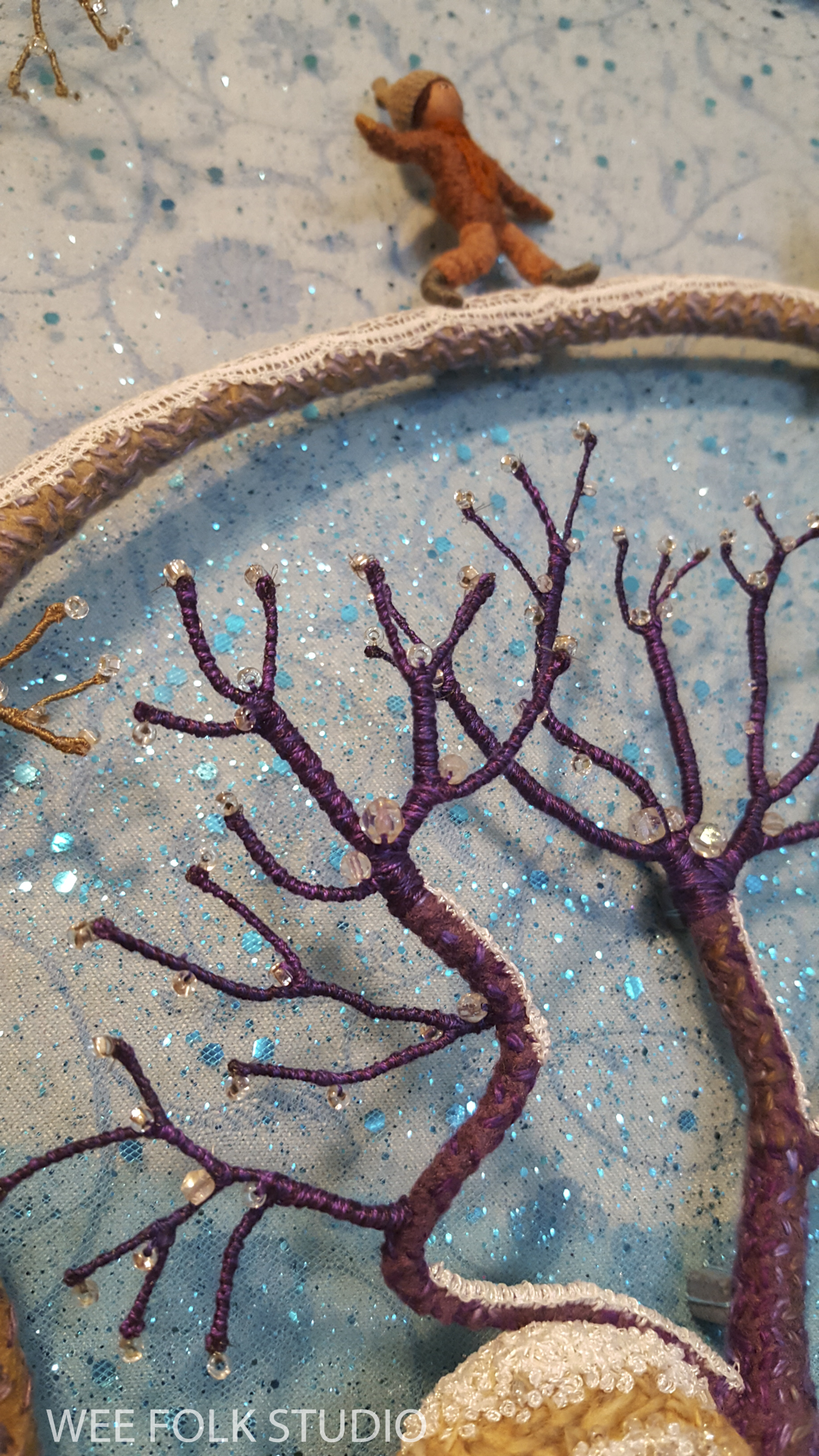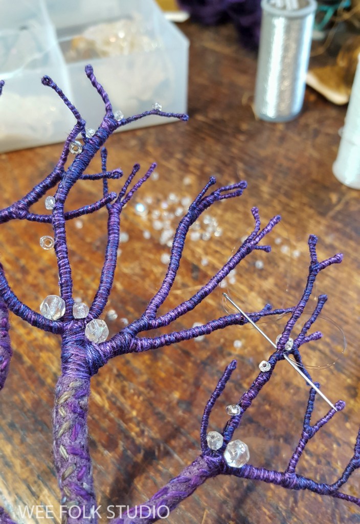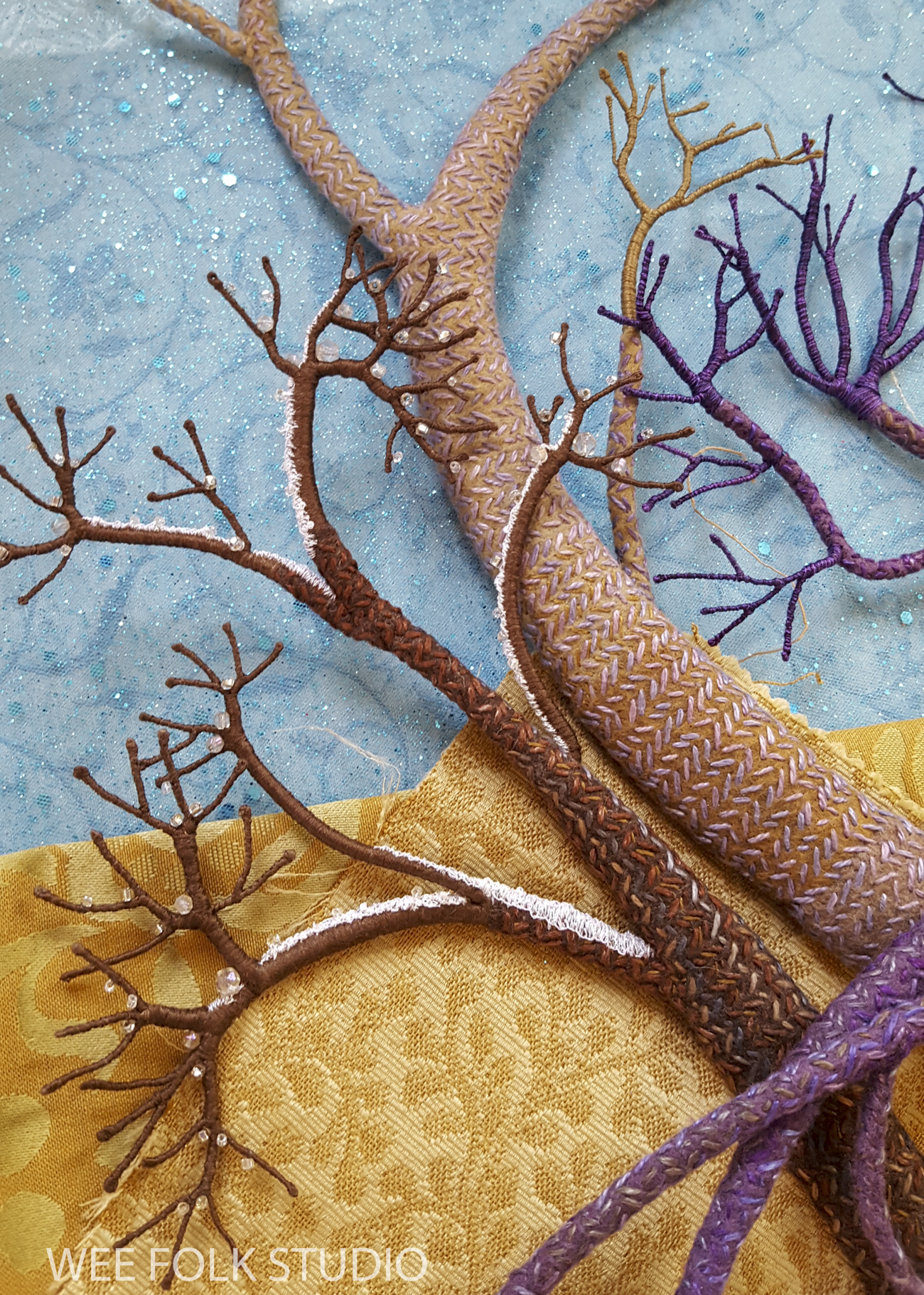 To help prop up the tree limbs, I sewed beads to the back and stitched them to the background fabric.