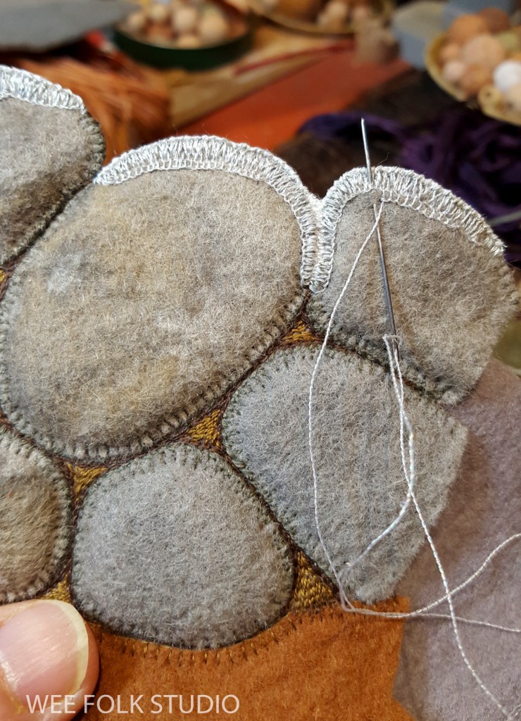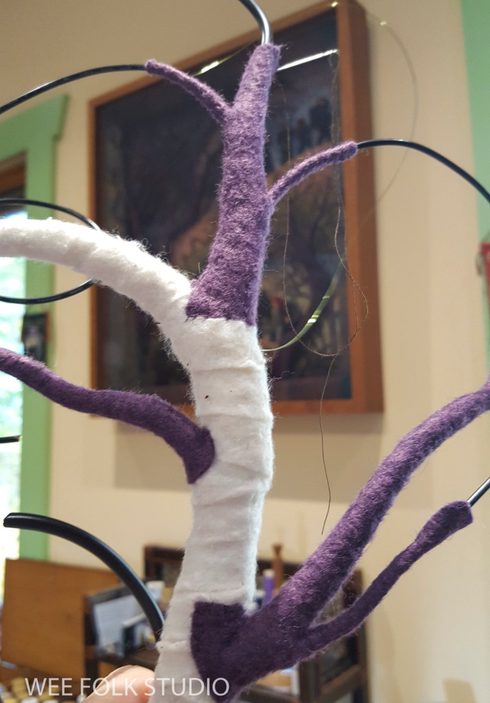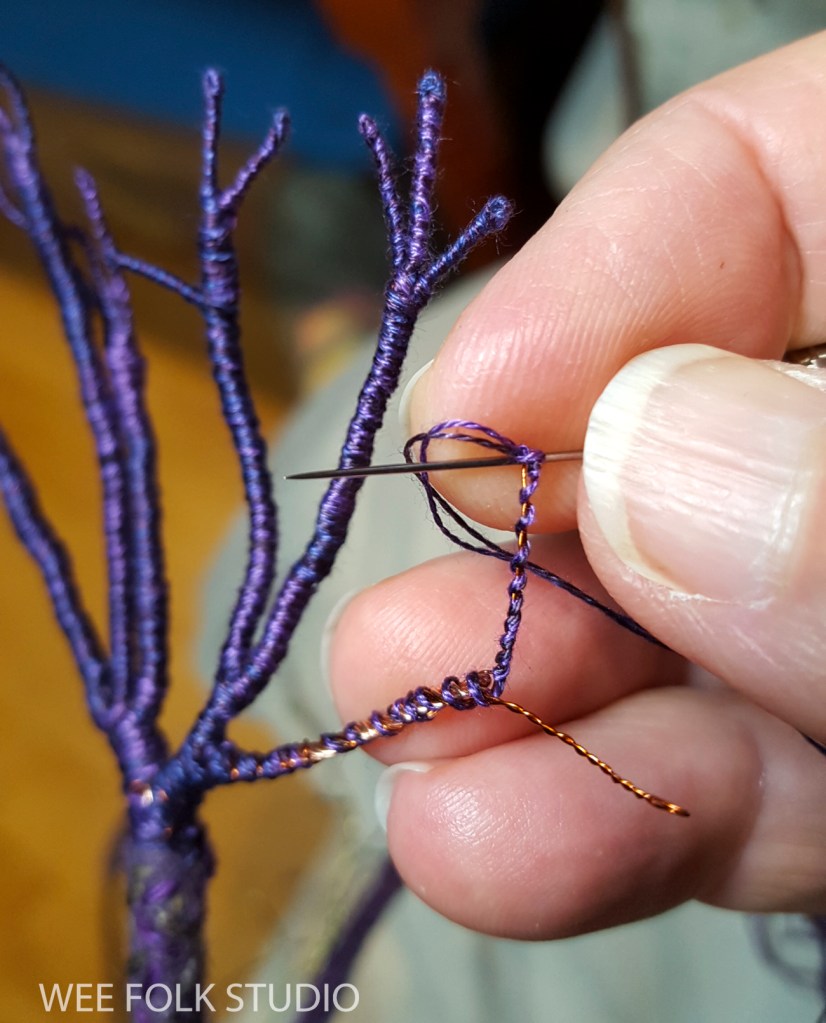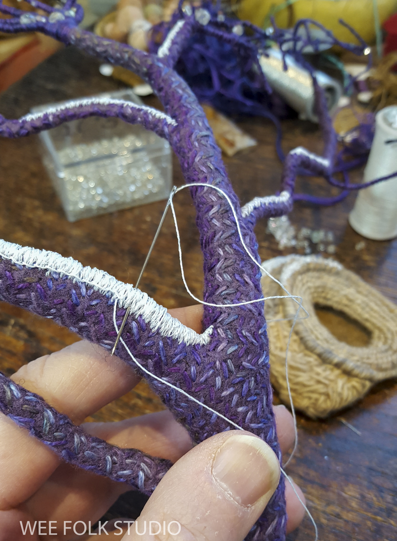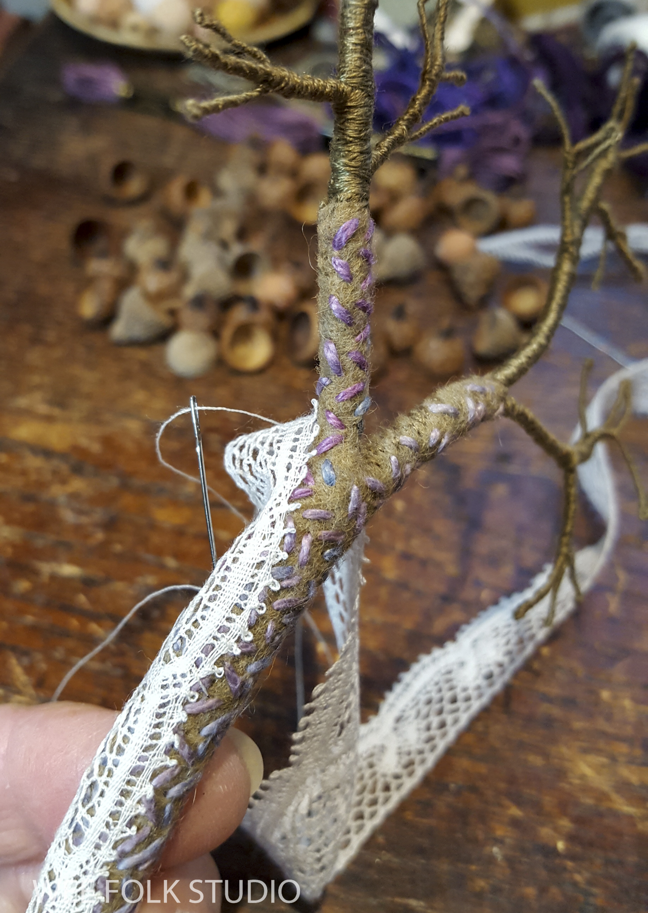 To help prop up the tree limbs, I sewed beads to the back and stitched them to the background fabric.