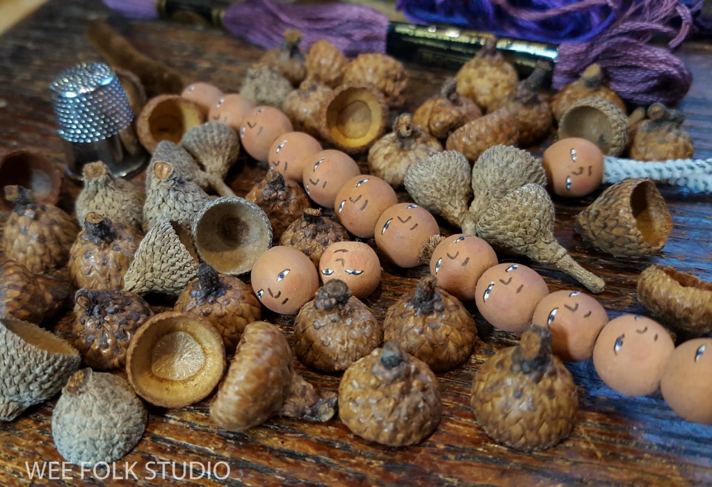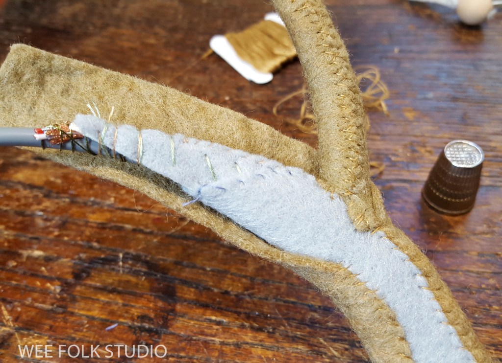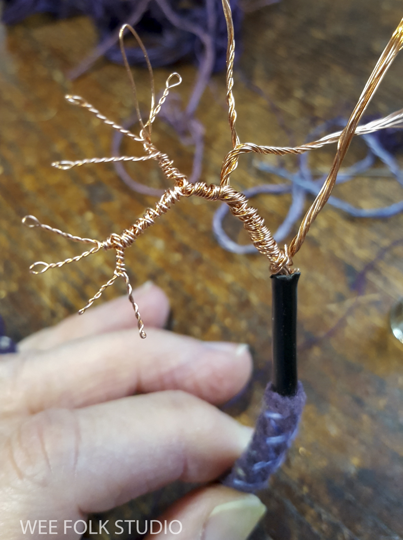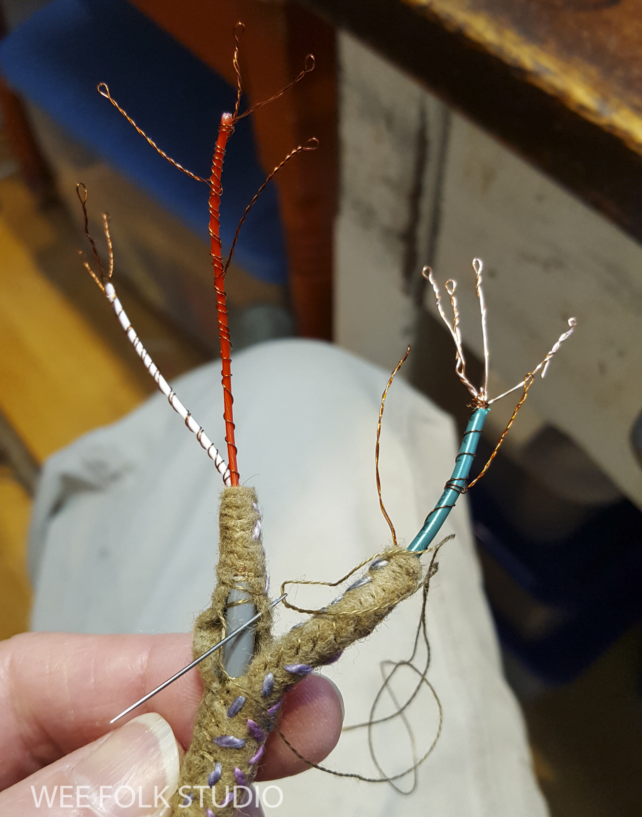 In this sequence of photos, you can see how I wrapped and stitched yarn around the wire arms and legs and then made a separate faux knitted coat to go on top. I completed the look with French knot buttons, striped leggings, wool hair, and a glued on acorn cap.
