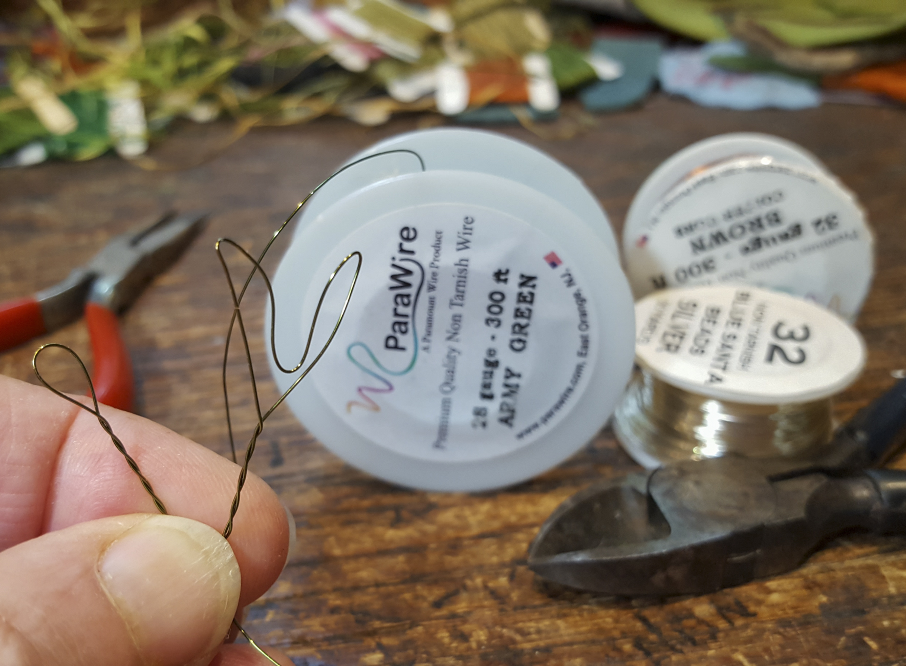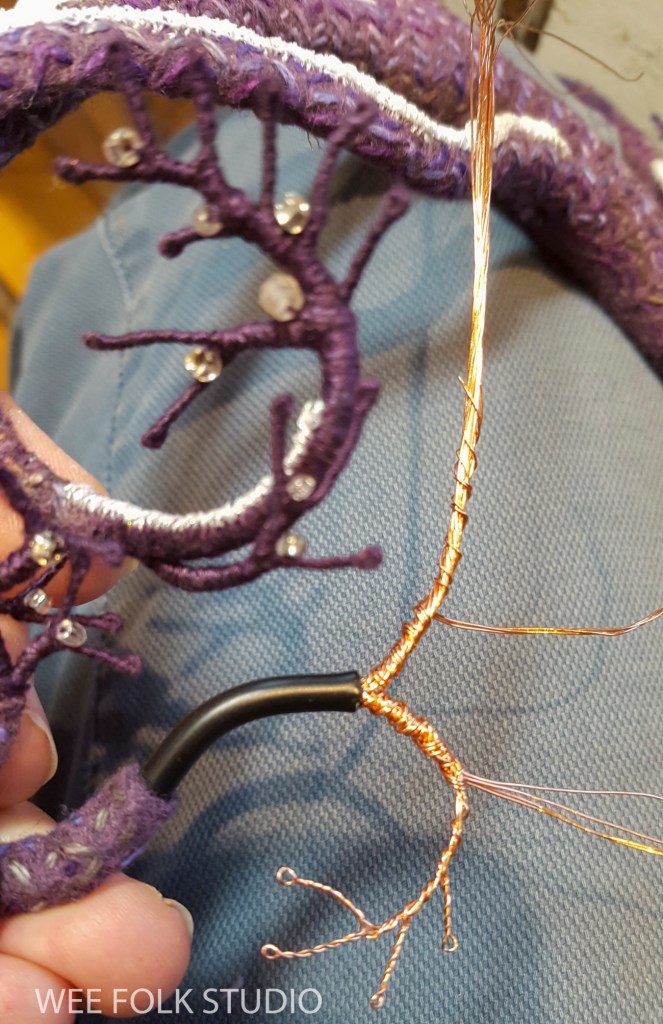 Instead of pipe cleaners, which would be too bulky, I formed the body armature out of 24 gauge jewelry wire. The bead heads were glued to the wire neck at the very end, when the clothing was finished. I glued small pieces of felt onto the top of the bead heads, in a kind of Mohawk. Later, when I added yarn hair, the felt gave the threaded needle something to catch onto.
