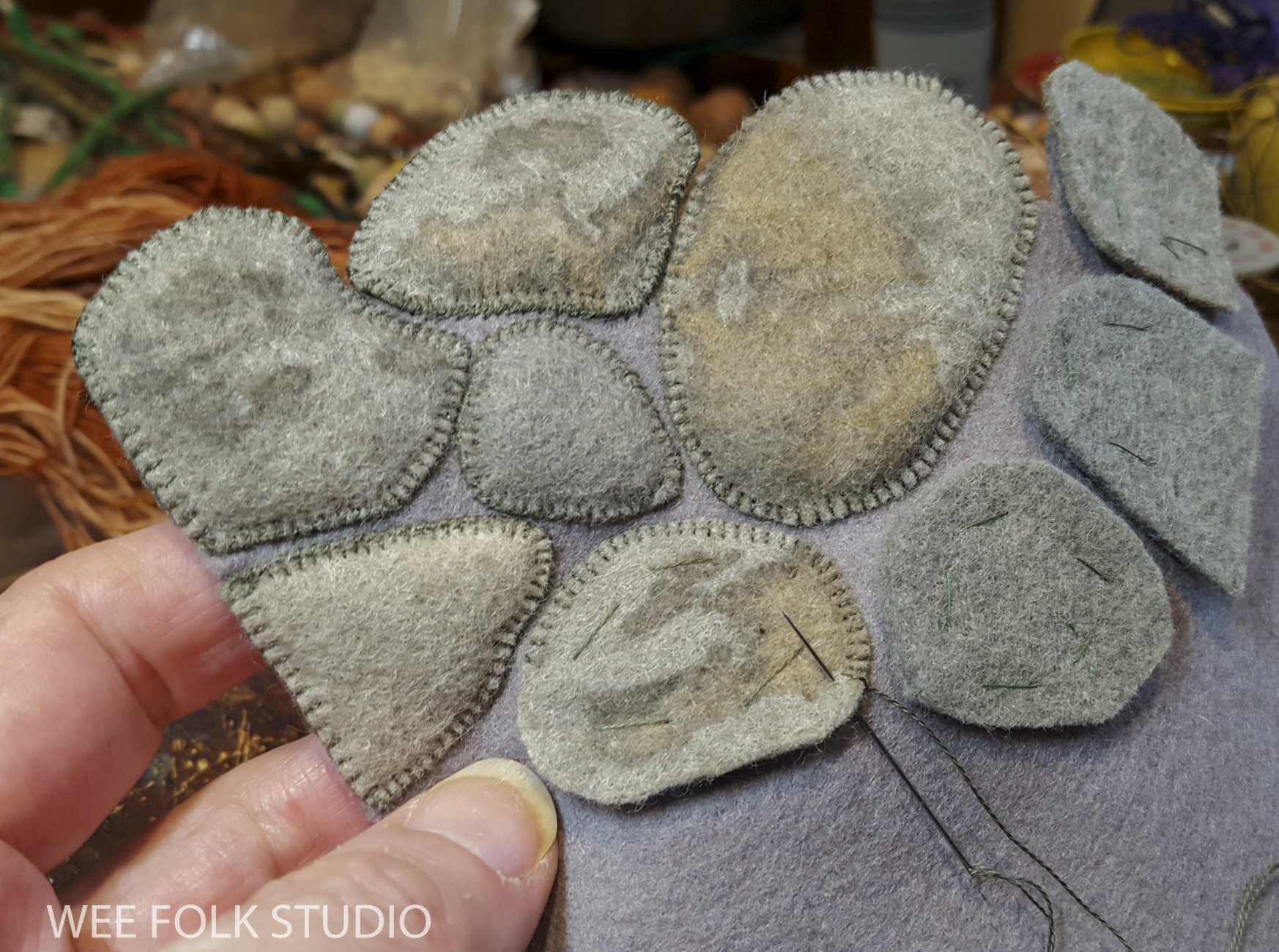 The full figures are about 2″ tall, with smaller ones peeking out of the holes in the shelters. To make them, I used the same basic techniques that I teach in my how-to book Felt Wee Folk, with some adjustments in the armature material and clothing.