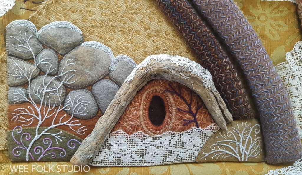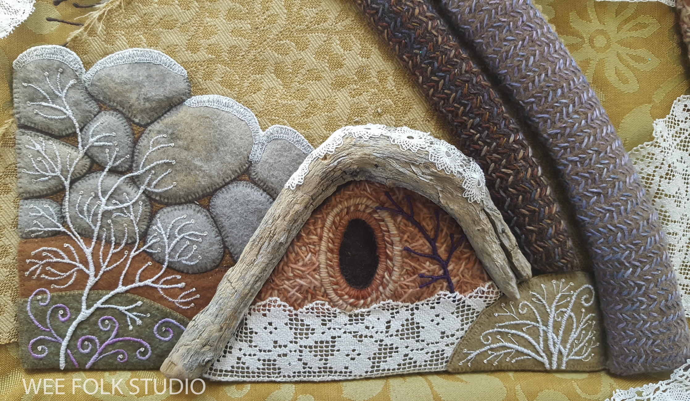 I made a border frame by padding and covering a wooden stretcher with upholstery fabric. I then hand sewed the layered background fabrics to the back of the stretcher, making it as taught as possible. After that, I sewed the different landscape sections to the background surface, starting with the lace snow cover, stone wall and driftwood house and ending with the trees.
