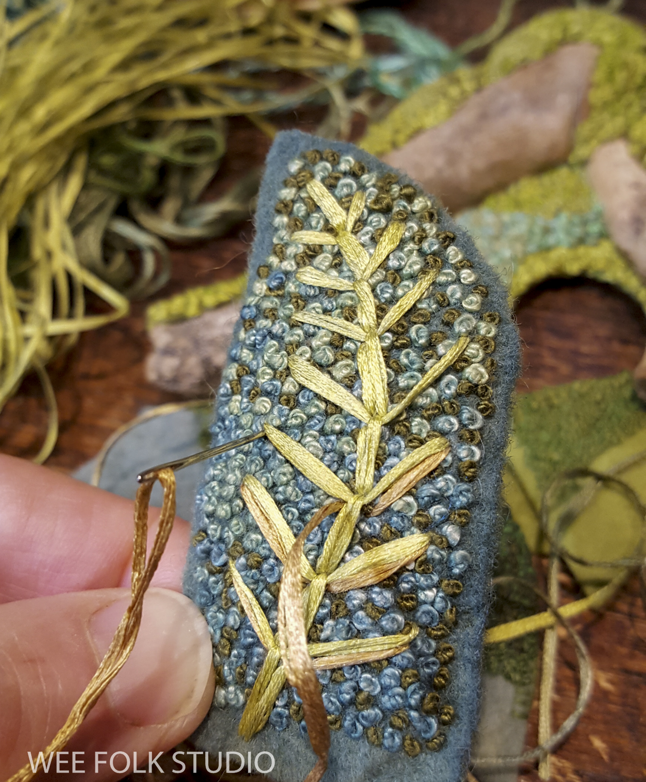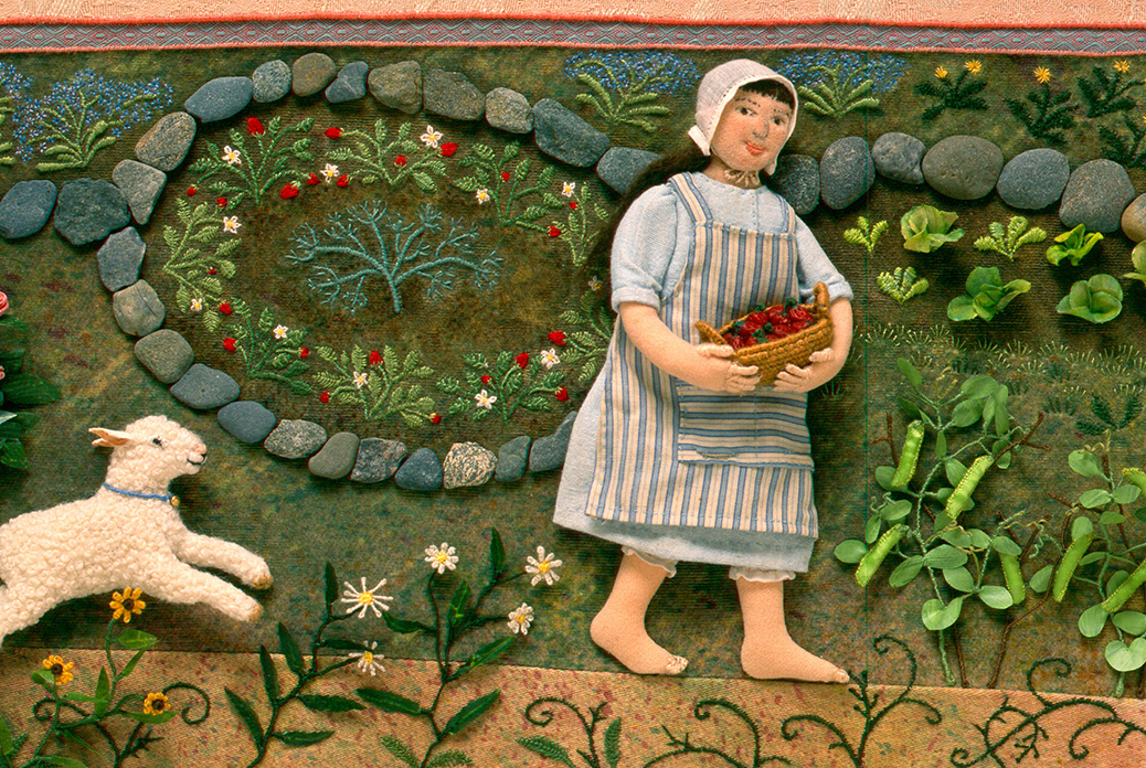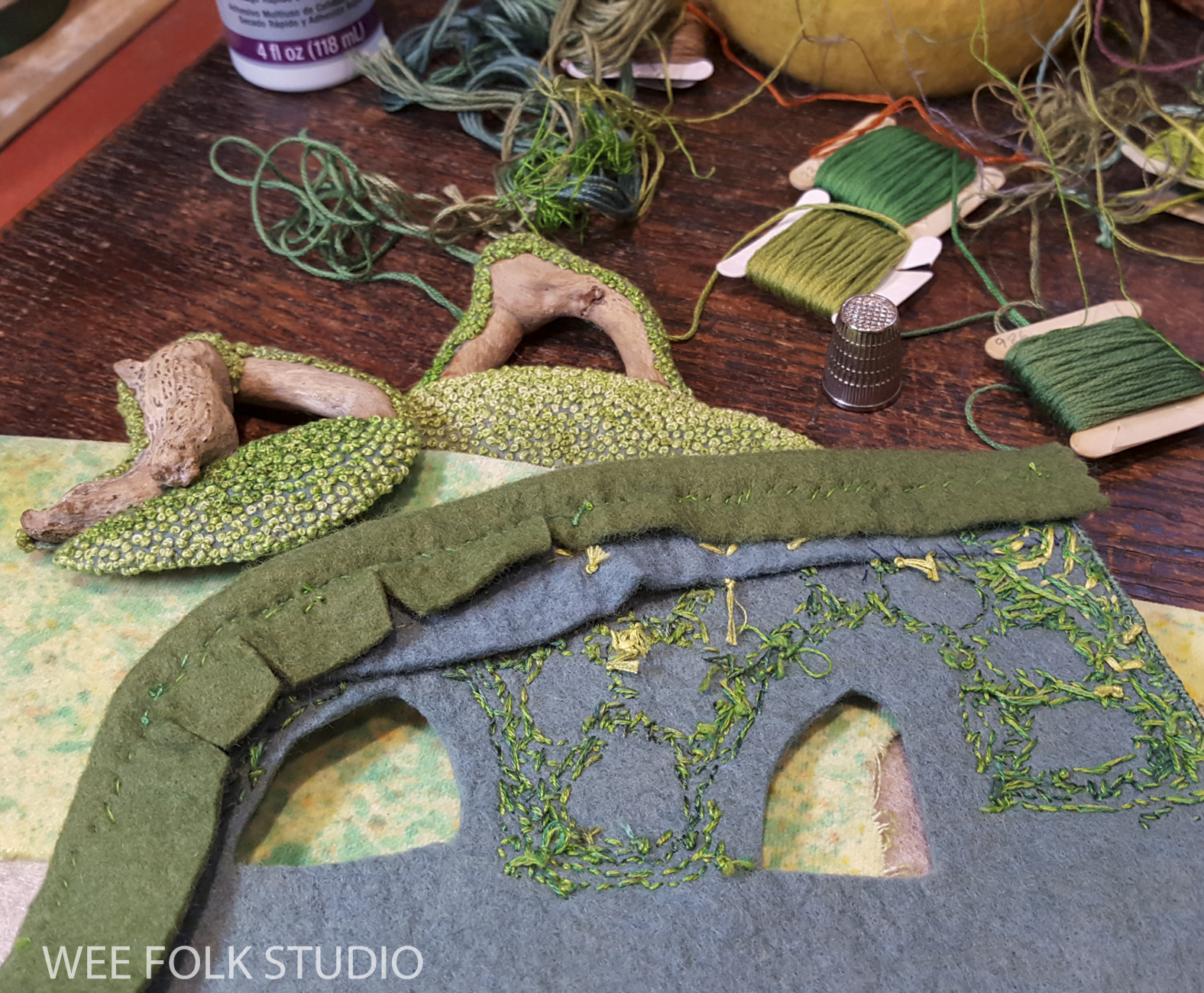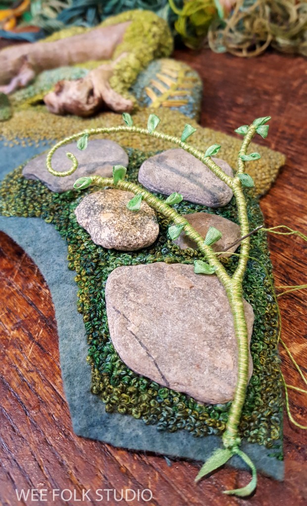 This is the 8th and final part of the series about making the spring landscape, Mossy Glen. All spring I’ve shared photos, videos and commentary about how I created the piece, from stitching moss to forming wire stems. I’ve saved the best for last – today’s post is about making the wee folk characters!