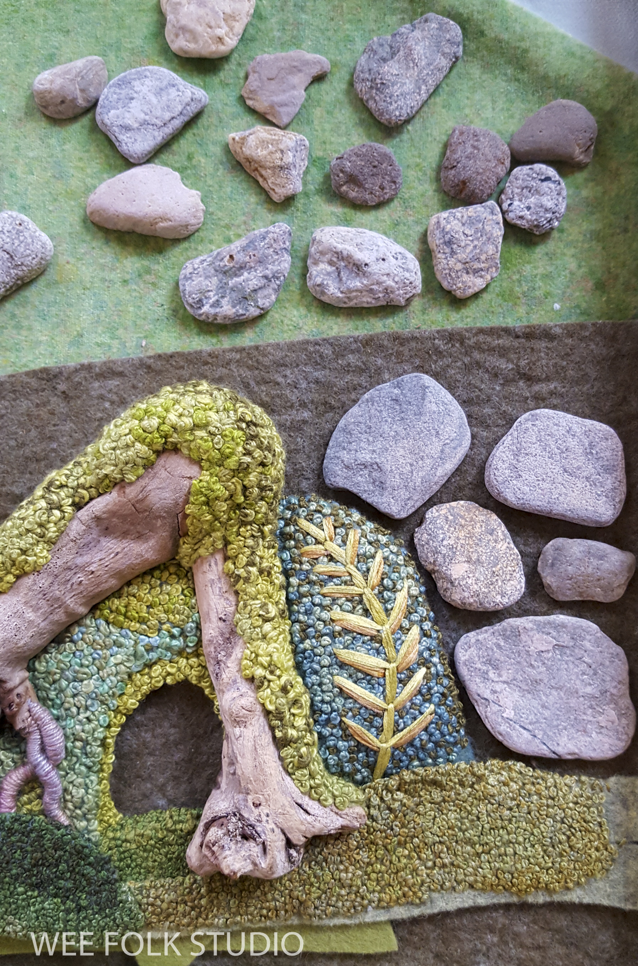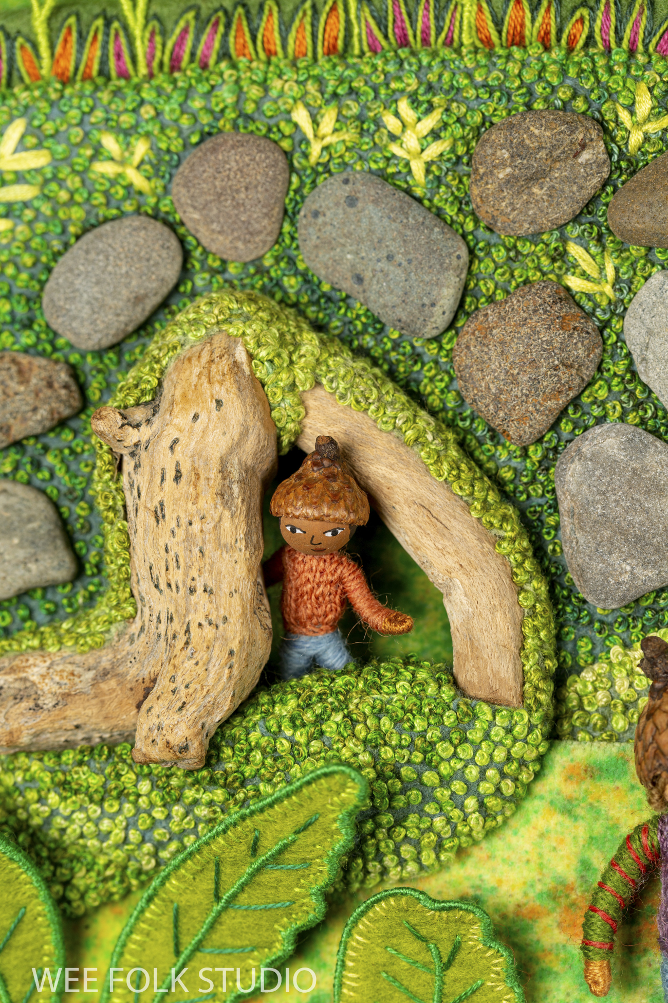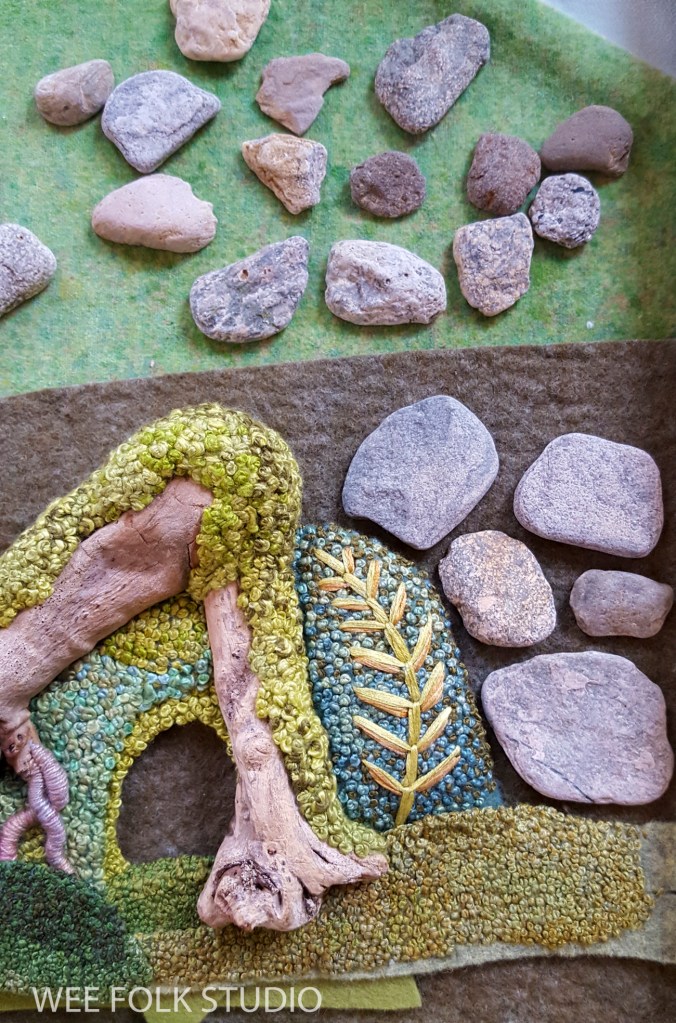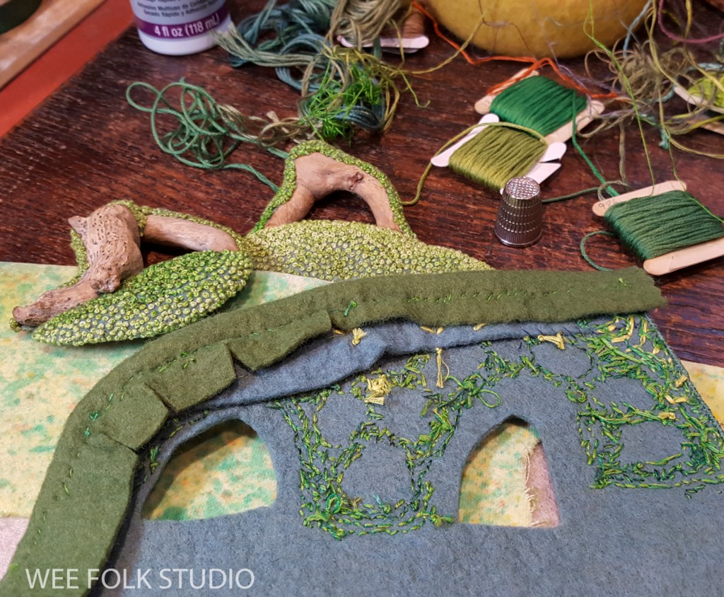 Now, let’s turn our attention back to the characters frolicking in the Mossy Glen. I’m never sure who is going to appear in these landscapes. They just show up one by one and claim their spots. After many months building places for the wee folk to live, it feels satisfying to finally meet them and let them take over.