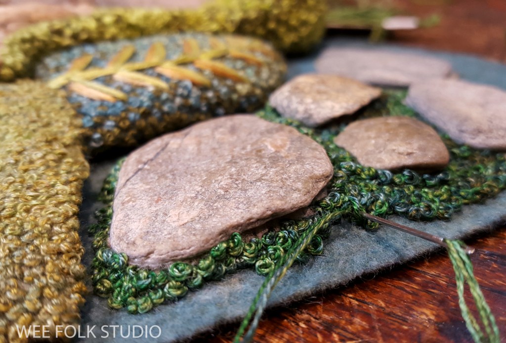 Part 1 is all about stitching a moss-like texture, Part 2 gives a glimpse at how I made the cherry trees, Part 3 is about the stone walls, Part 4 shows how I made the forsythia blossoms, Part 5 features wire and felt leaves, Part 6 is about chain-stitching leaves and Part 7 looks at the violets and berries.